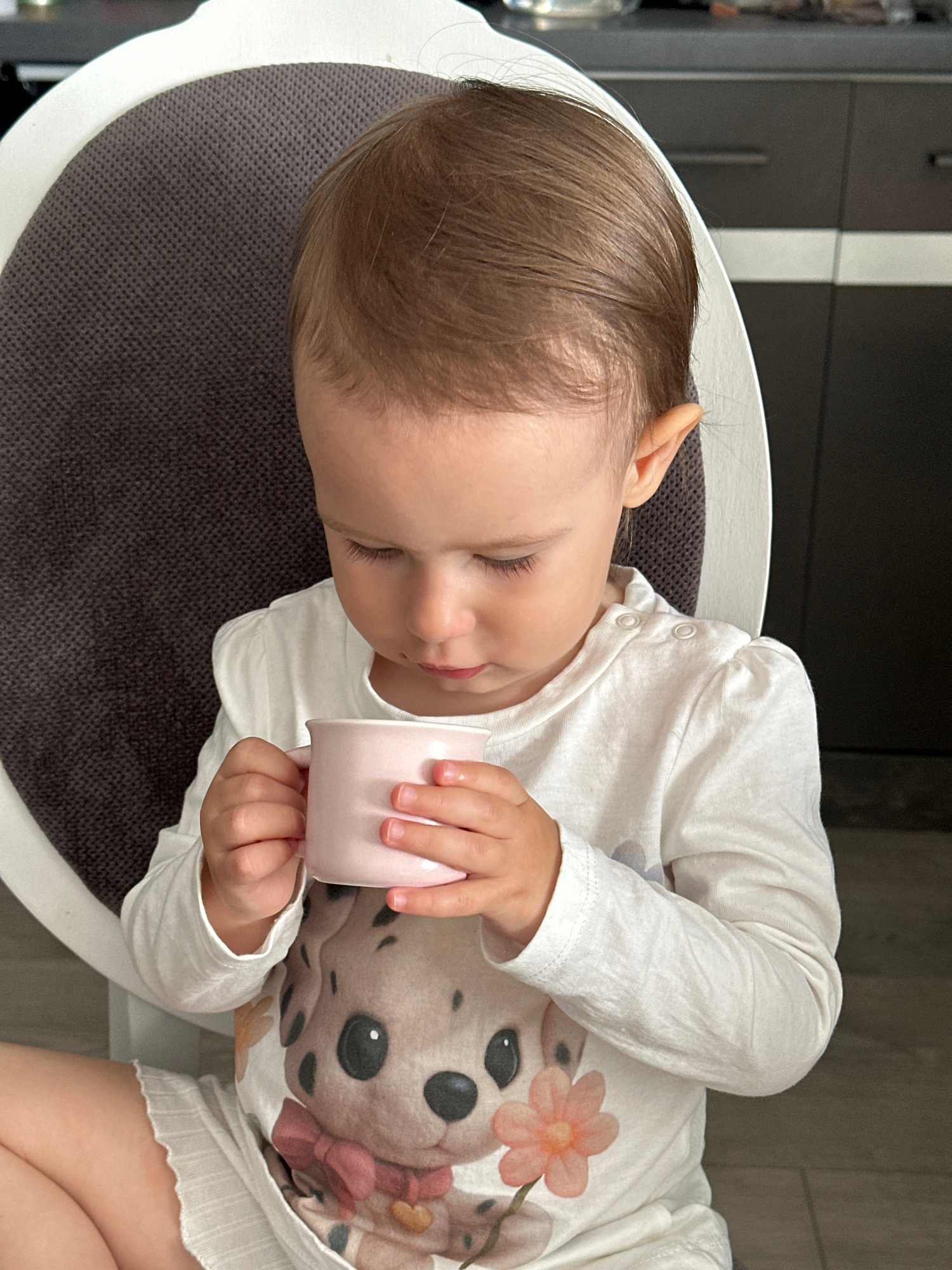 A young child is sitting in a white chair with a dark gray cushioned seat. The child has fair skin, brown hair, and is wearing a long-sleeved white shirt featuring a print of an animal with a flower o…read more