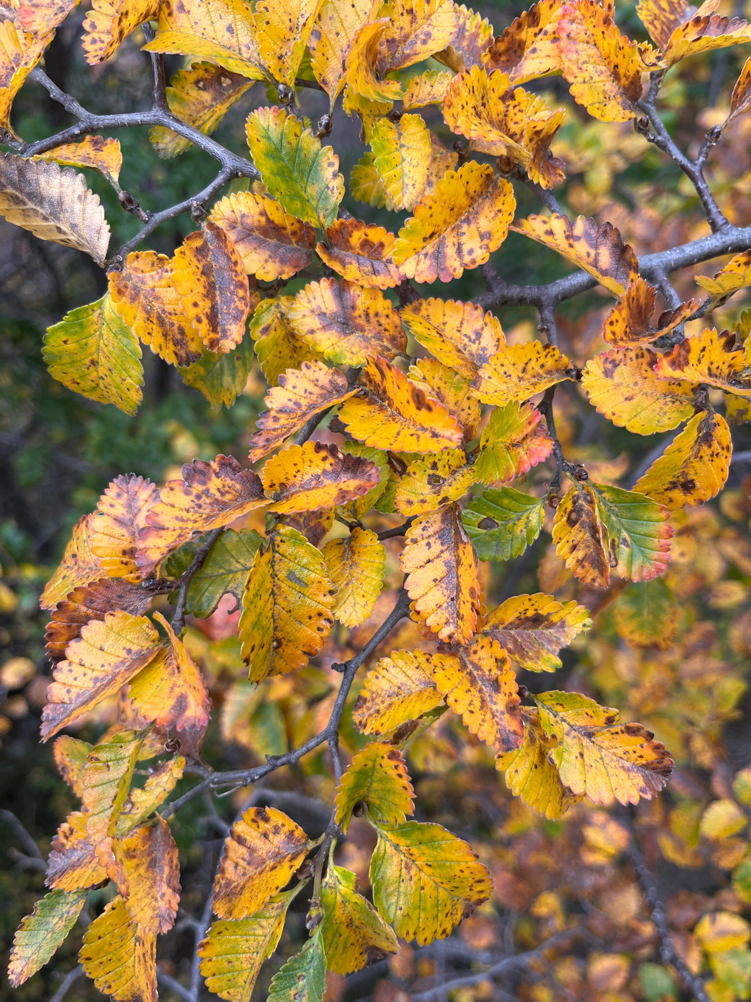 The image shows a close-up view of tree branches with autumn leaves in Ushuaia, Argentina. The leaves are primarily yellow and brown, with some remaining green. Many of the leaves have brown spots. Th…read more