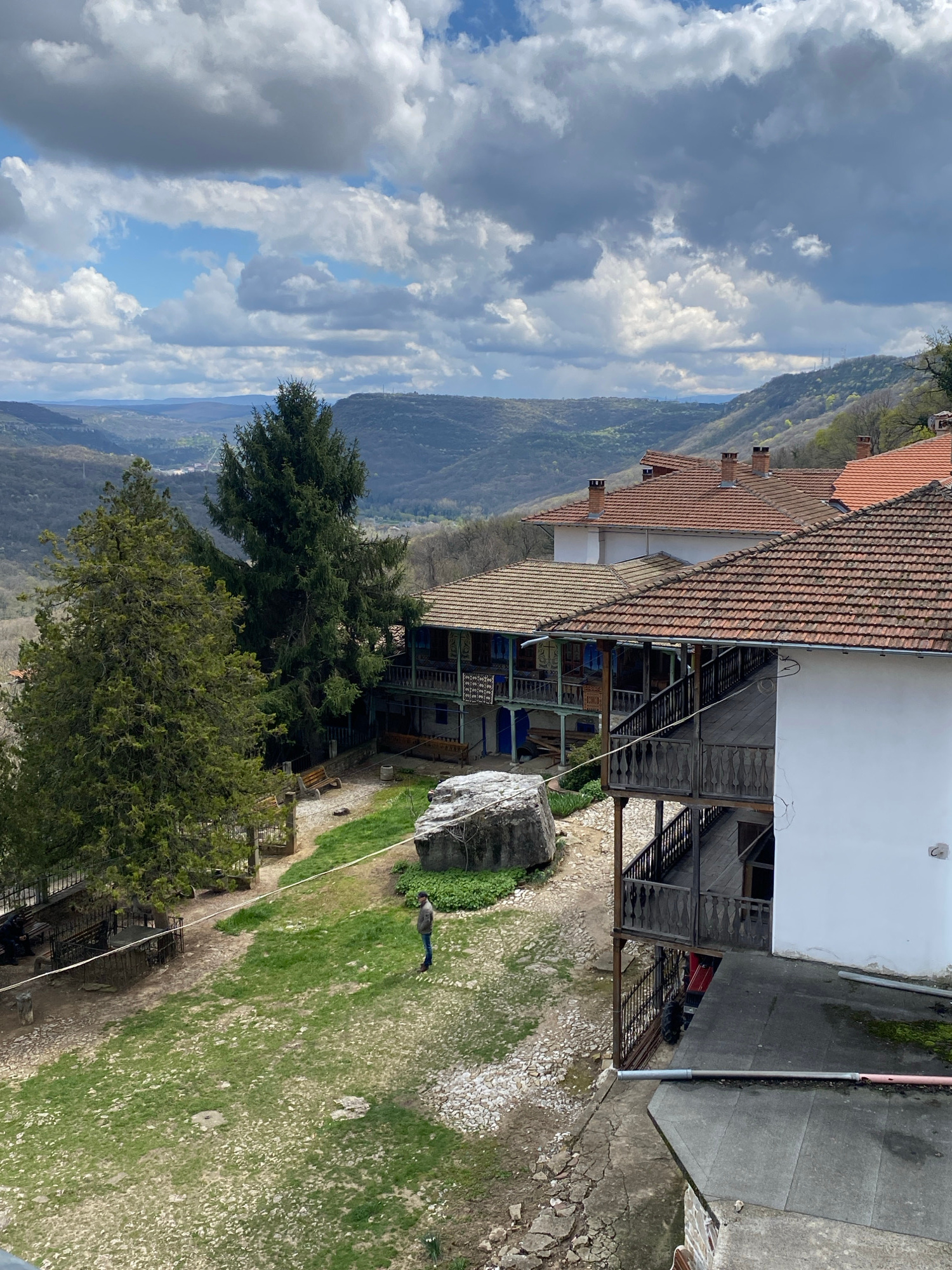 The image captures a scene in Samovodene, Bulgaria. A building with a red-tiled roof and a white facade dominates the upper right portion of the image. The building has an open, multi-tiered structure…read more