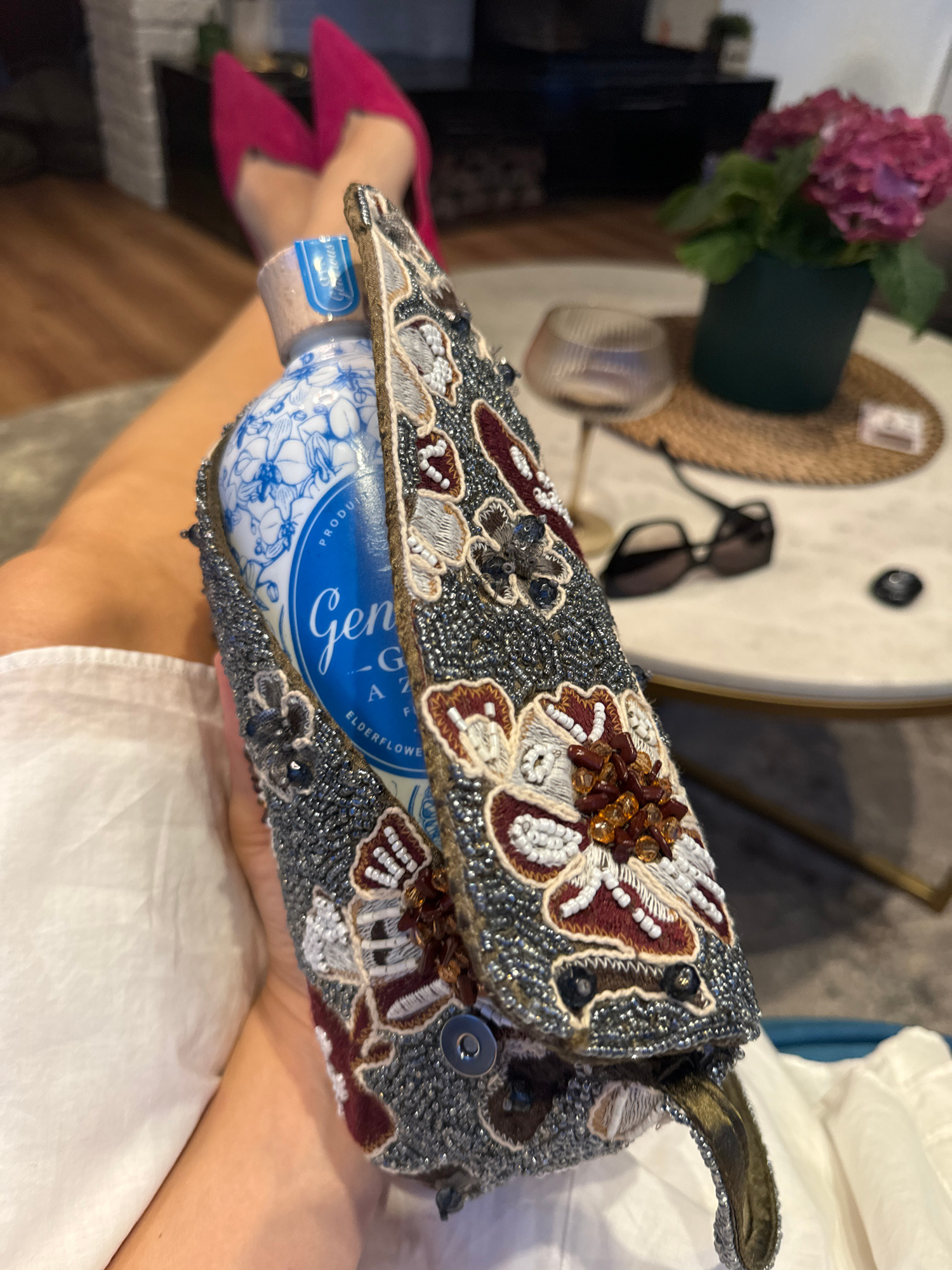 This indoor shot, taken in Carnikava, Latvia, focuses on a person holding a highly decorative clutch bag. The clutch is intricately embellished with grey beads forming the main body, accented by embro…read more