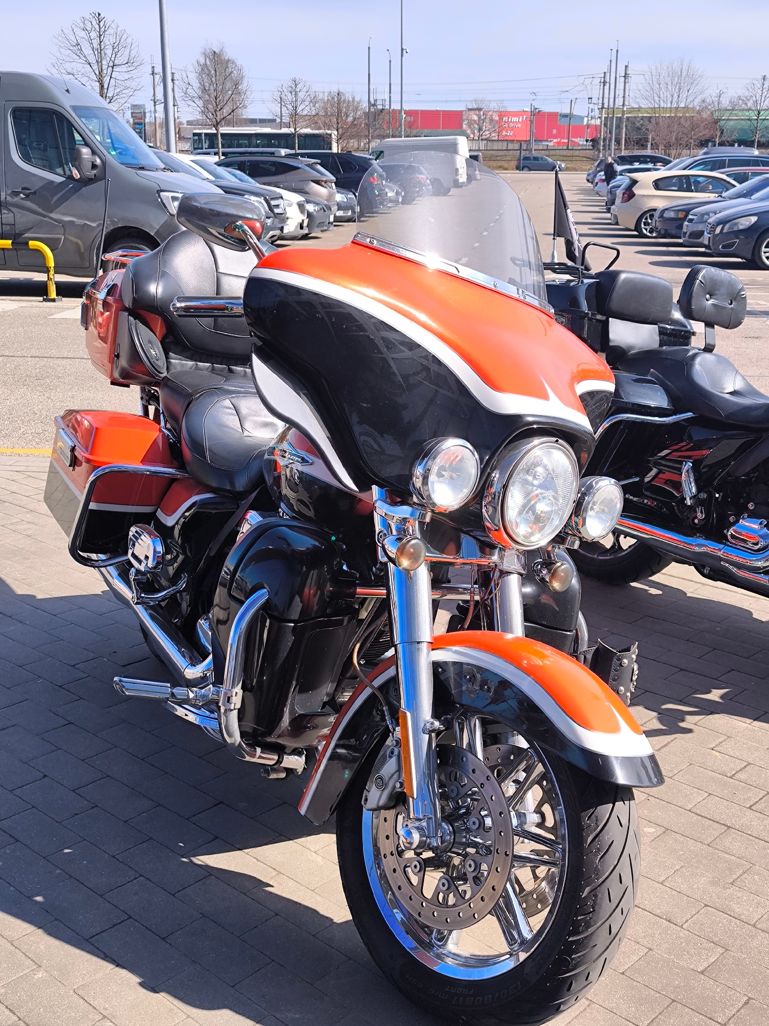 The image shows two motorcycles parked in a paved lot, with other vehicles visible in the background. The motorcycle in the foreground is an orange and black Harley-Davidson touring model. It has a la…read more