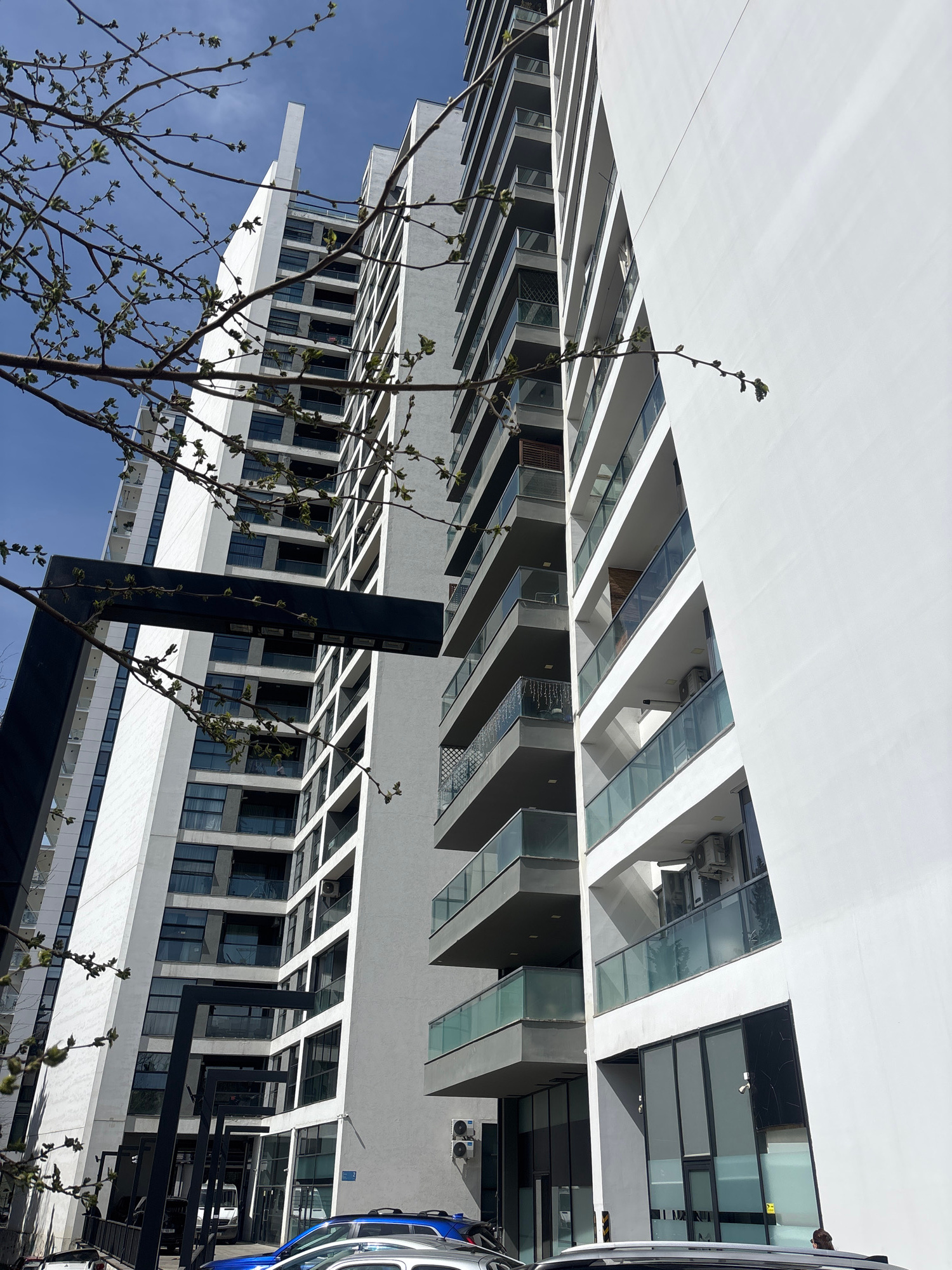 The image captures an upward view of a modern building with a white facade and cantilevered balconies. The balconies feature glass railings and dark window frames. The building is located in Tbilisi,…read more