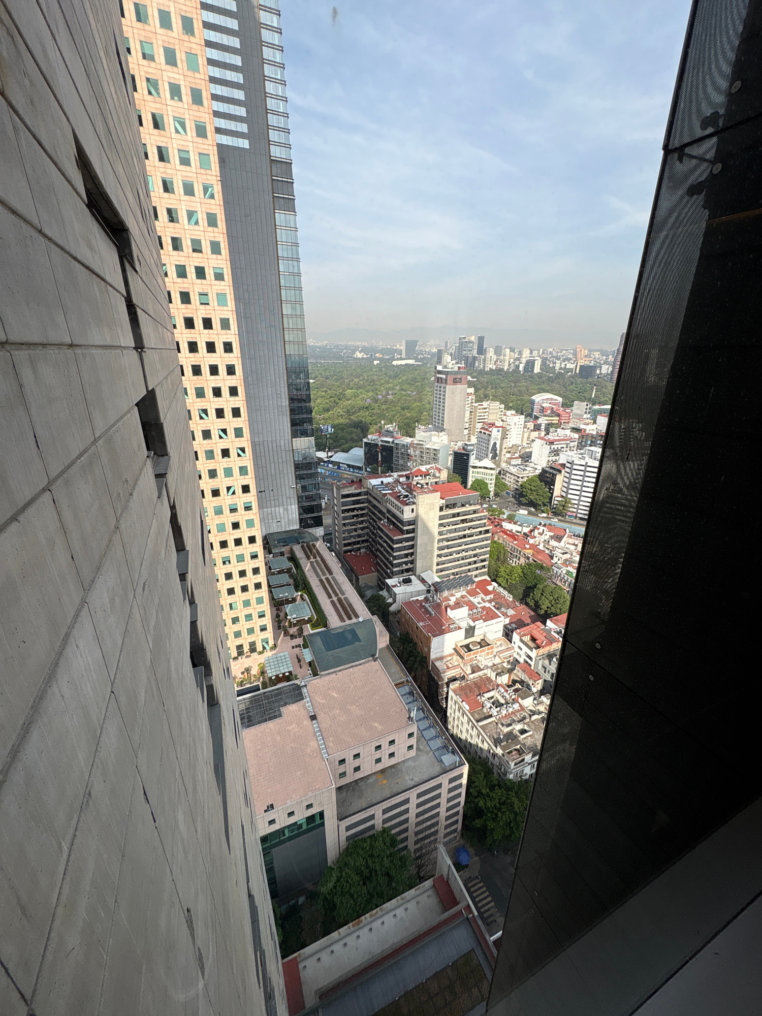 The image captures a high-angle, nearly vertical view from a high-rise building in Mexico City, Mexico. The foreground consists of a tiled, stone-like surface, presumably the building's exterior or ro…read more