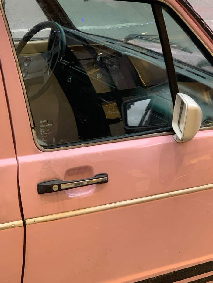 The image shows the driver's side of a pink vehicle. A side mirror is attached to the upper right corner of the window. A black door handle is beside the window, mounted vertically on the vehicle. Theβ¦read more