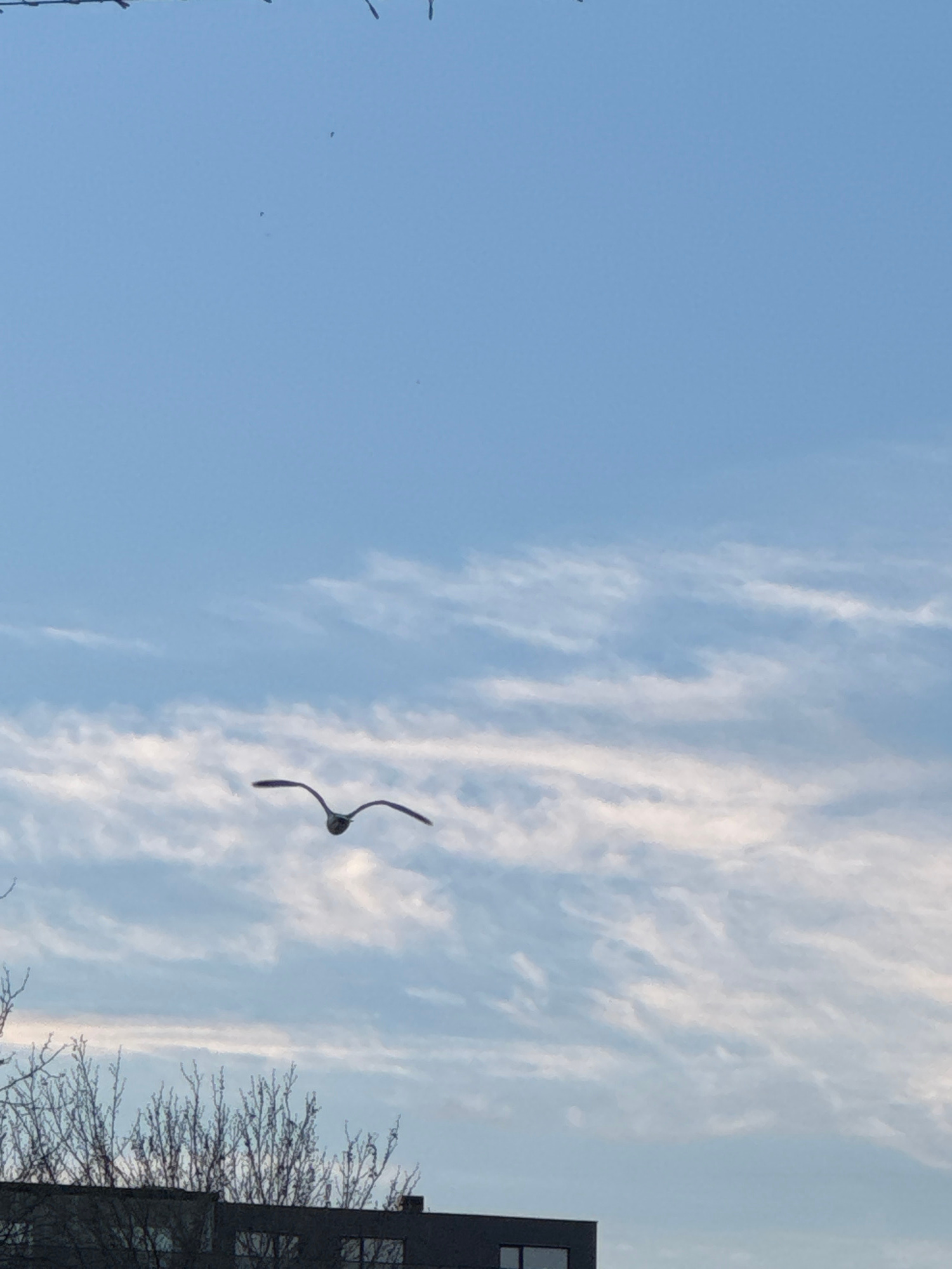 The image depicts a bird in flight against a sky with scattered cirrus clouds. The sky is predominantly blue. A building and bare tree branches are visible on the right side of the image. While it's i…read more