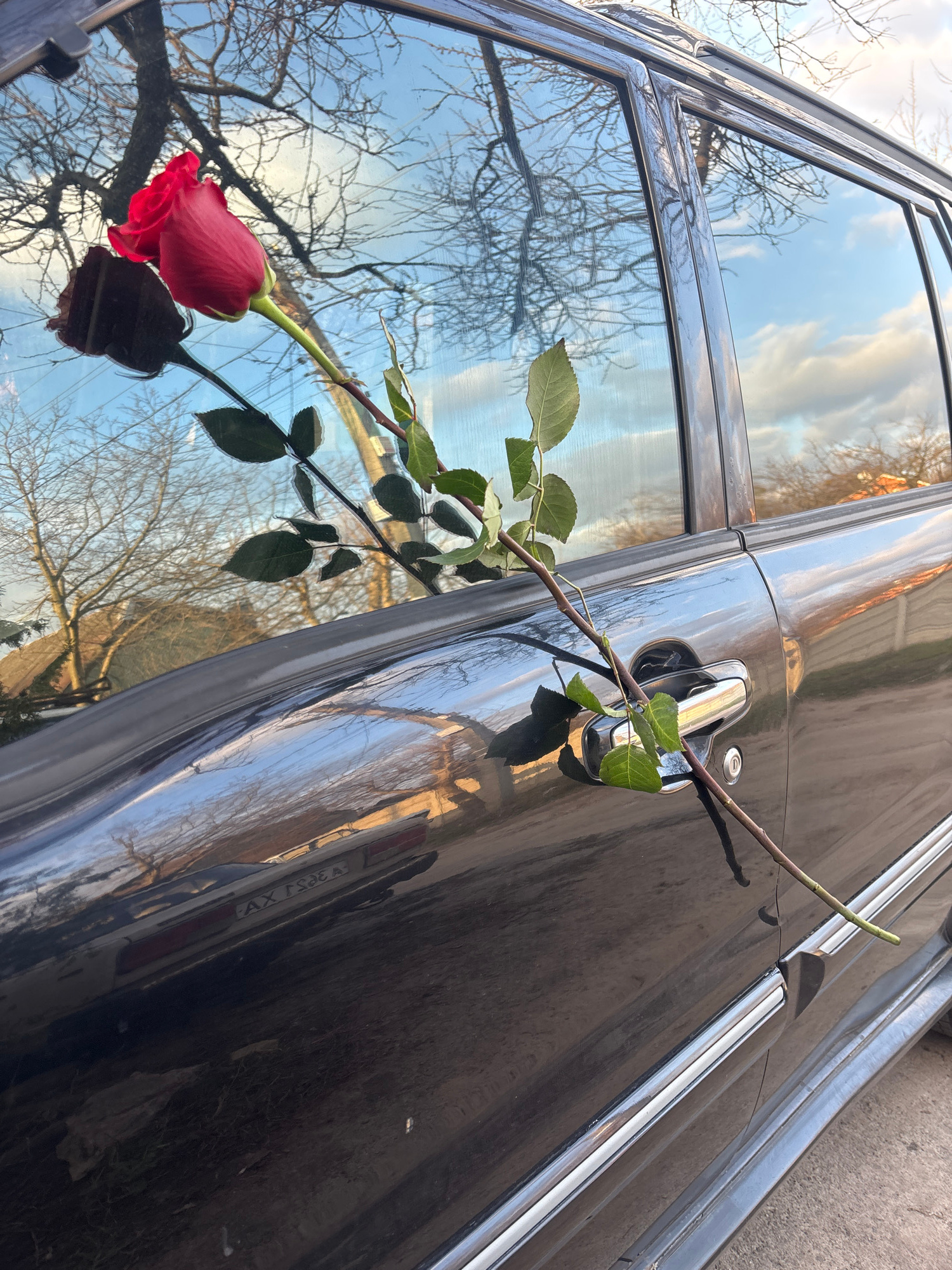 A red rose is draped over the handle of a black car. The car is parked on a concrete surface. The car door is reflecting a sky with bare trees. The license plate of the car is partially visible and re…read more