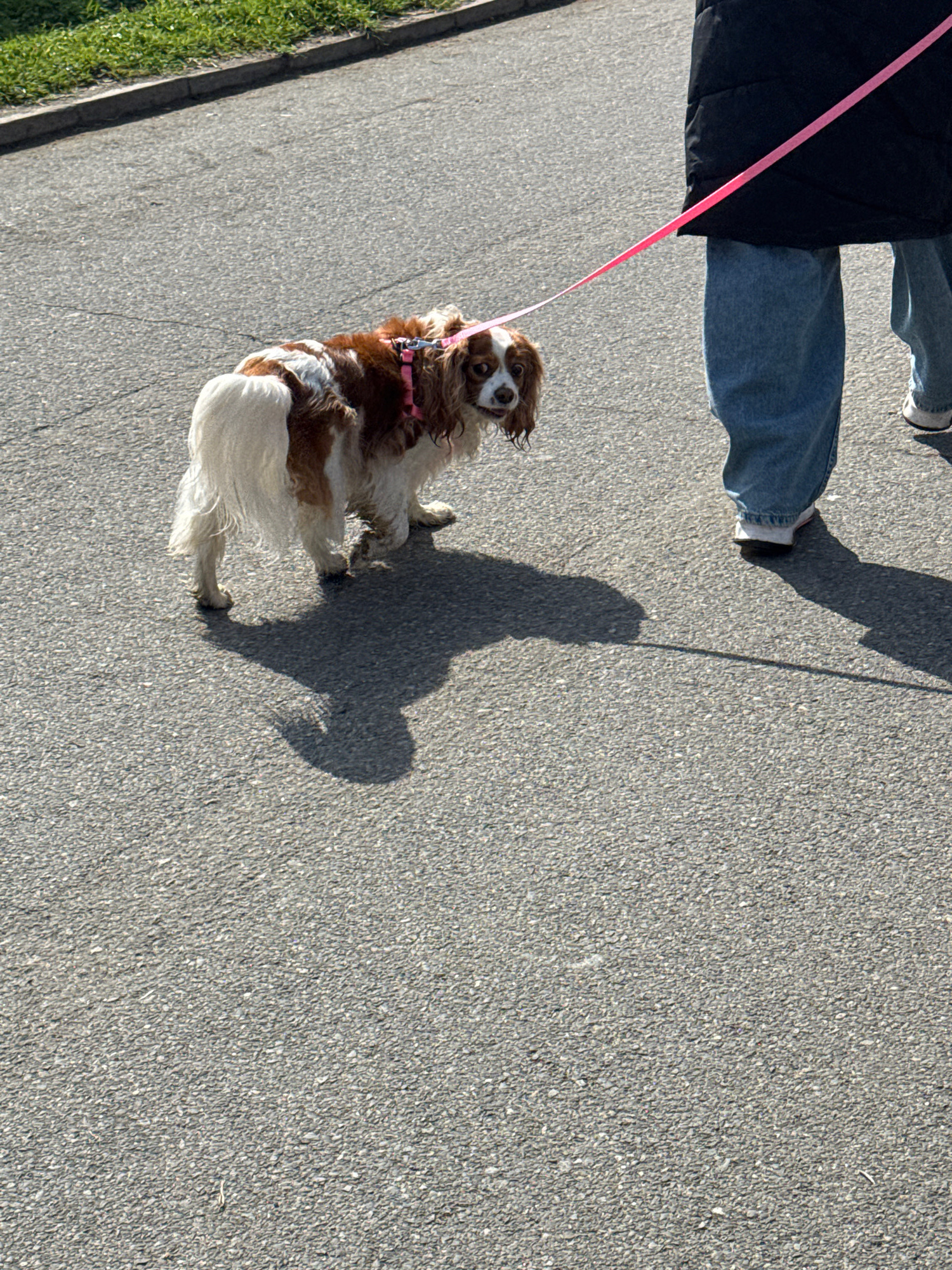 The image shows a Cavalier King Charles Spaniel being walked on a gray asphalt surface. The dog is on a pink leash. Only the legs and feet of the person walking the dog are visible. The scene appears…read more