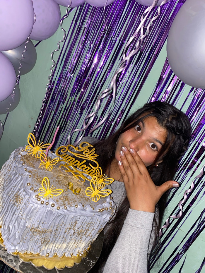 A young woman is posing with a celebratory birthday cake. She has dark hair and a grey sweater. Her hand is covering her mouth, and she’s looking toward the viewer. The birthday cake is light purple w…read more