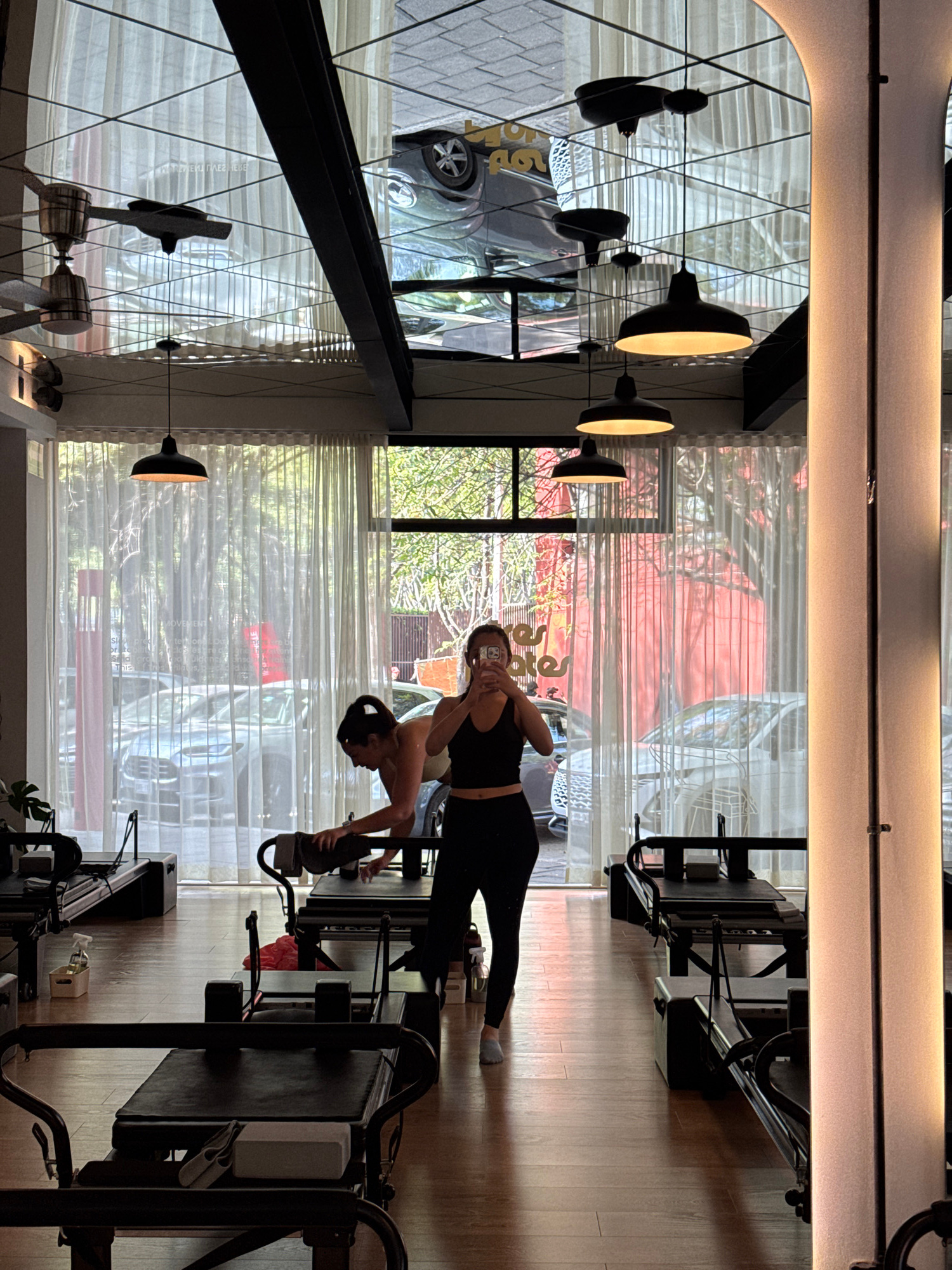 The image depicts an indoor scene, likely a Pilates or fitness studio, characterized by modern design and ample natural light. The room features light wooden flooring, large windows, and sheer white c…read more