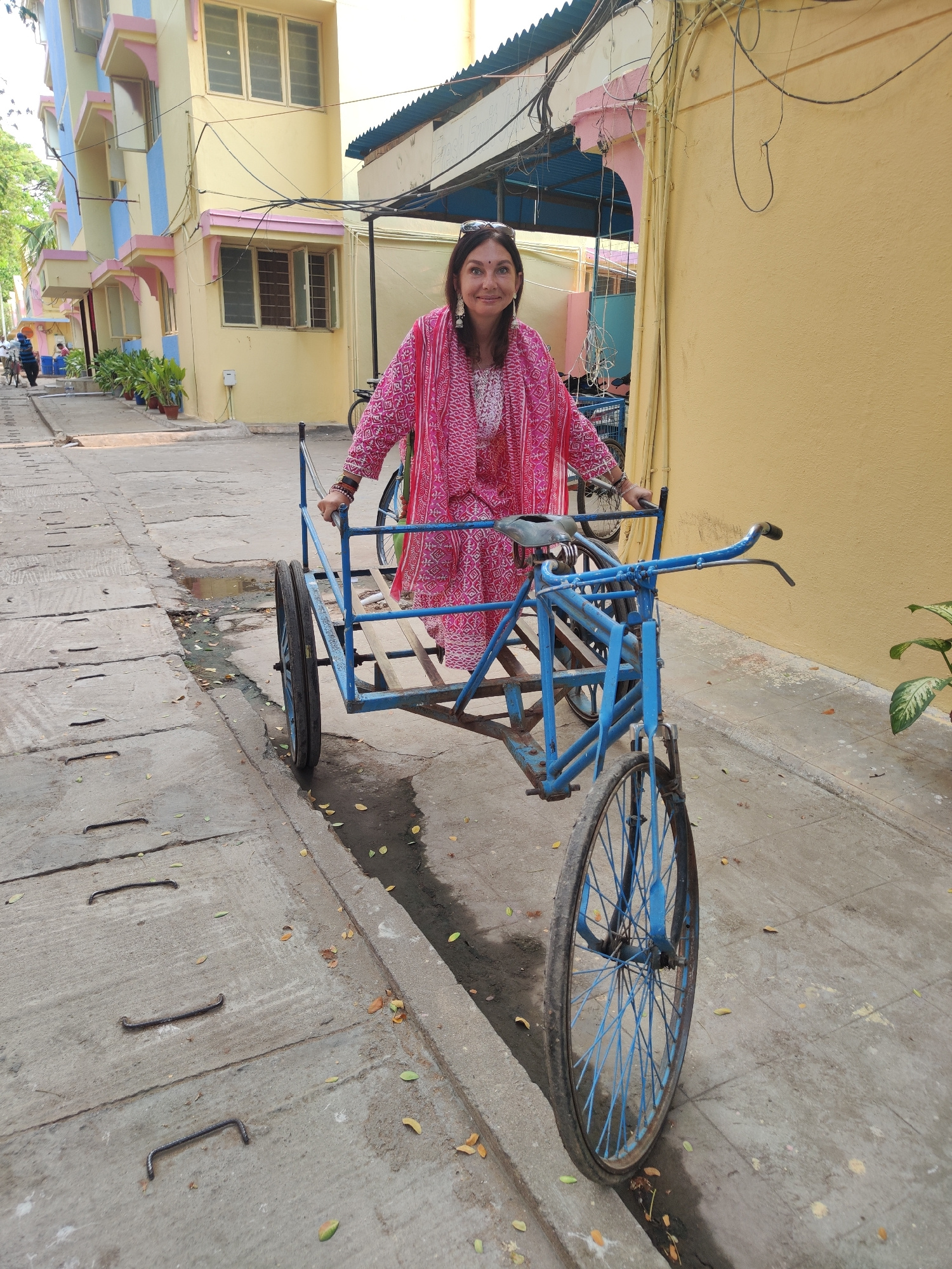 A woman stands next to a blue rickshaw in Puttaparthi, India. She wears a pink patterned kurta and sunglasses. The rickshaw has one large front wheel and two smaller rear wheels. The location is a paved area adjacent to buildings with yellow and pink paint. A storm drain runs alongside the road. | Open Wire
