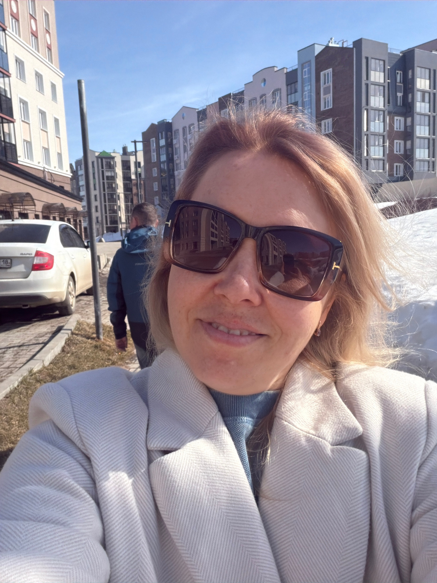 A woman is taking a selfie outdoors. She is wearing sunglasses and a light-colored coat. A city street scene is in the background. A white car is parked on the street. A man in a blue jacket is walkin…read more
