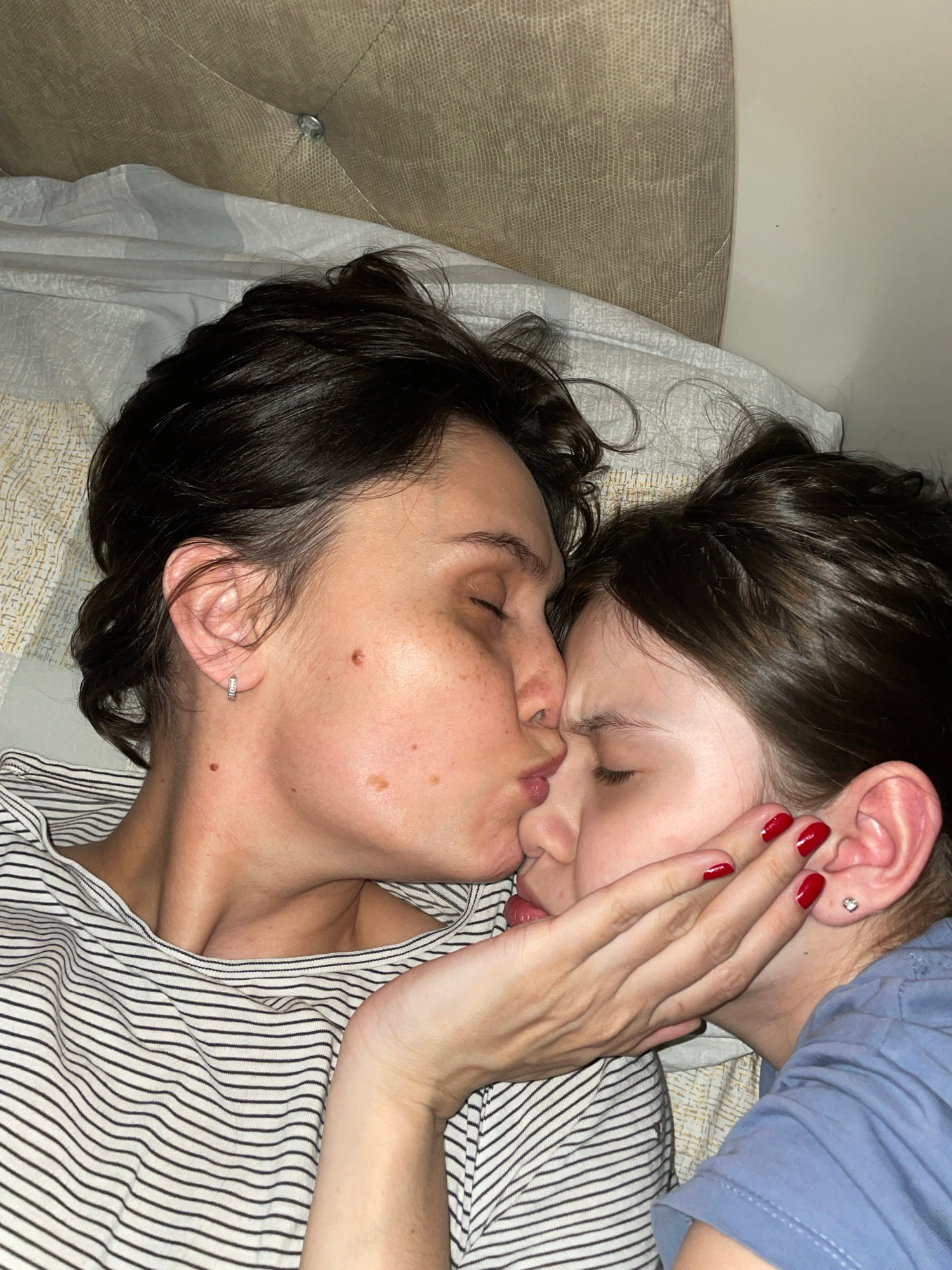 Two individuals are in close proximity, likely in a domestic setting. One individual, wearing a black and white striped shirt, is lying on a bed or similar surface covered with patterned bedding. The…read more