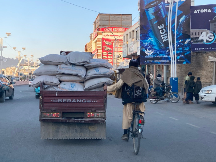 This image depicts a bustling street scene in Kandahar, Afghanistan, at what appears to be late afternoon or early evening. In the foreground and midground, a reddish-brown flatbed truck, marked "BERβ¦read more
