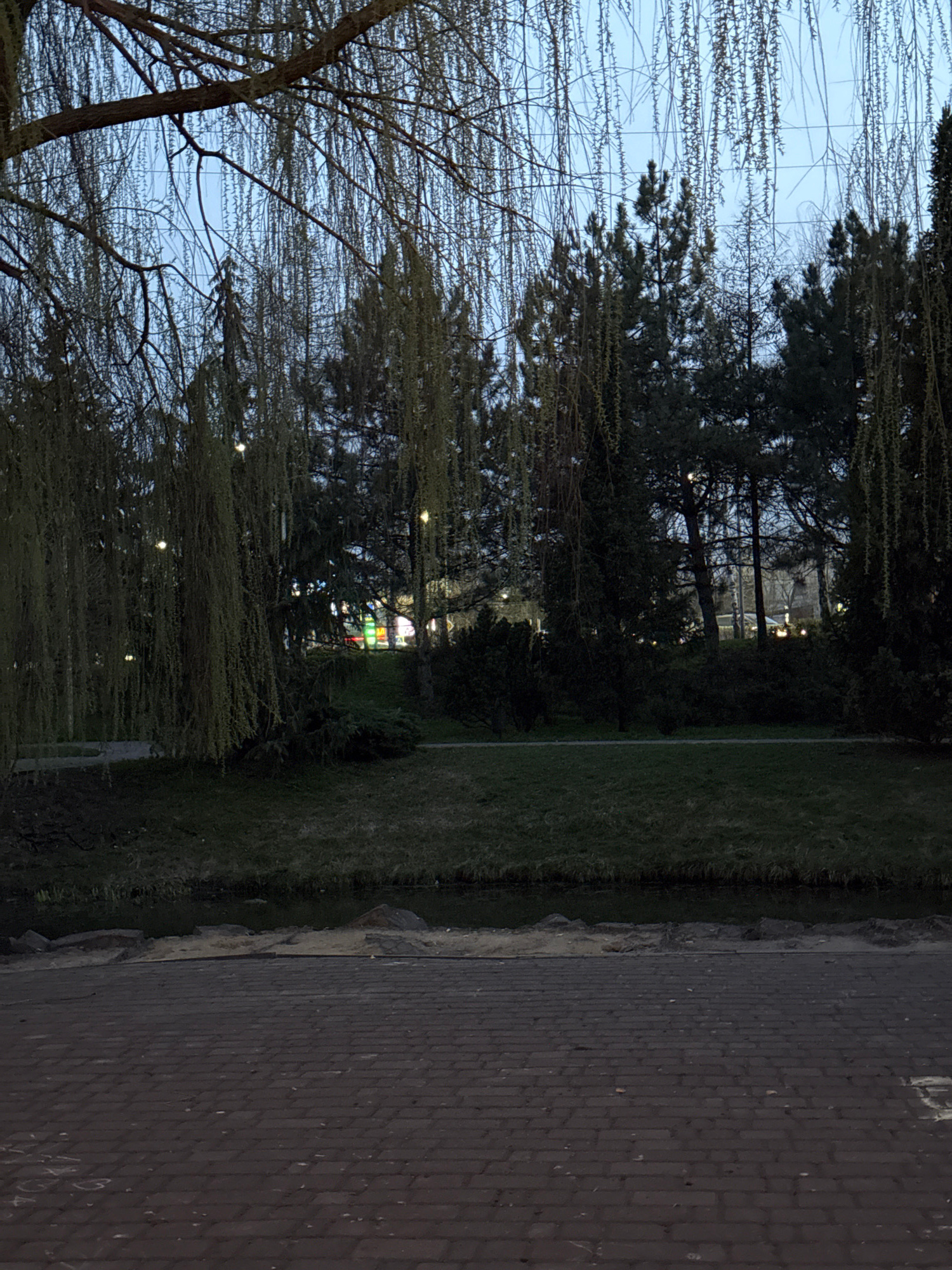 The image shows a path in a park or green space. A brick-paved walkway runs along the right side of the image. To the left of the walkway is a strip of grass. Trees line the opposite side of the grassβ¦read more