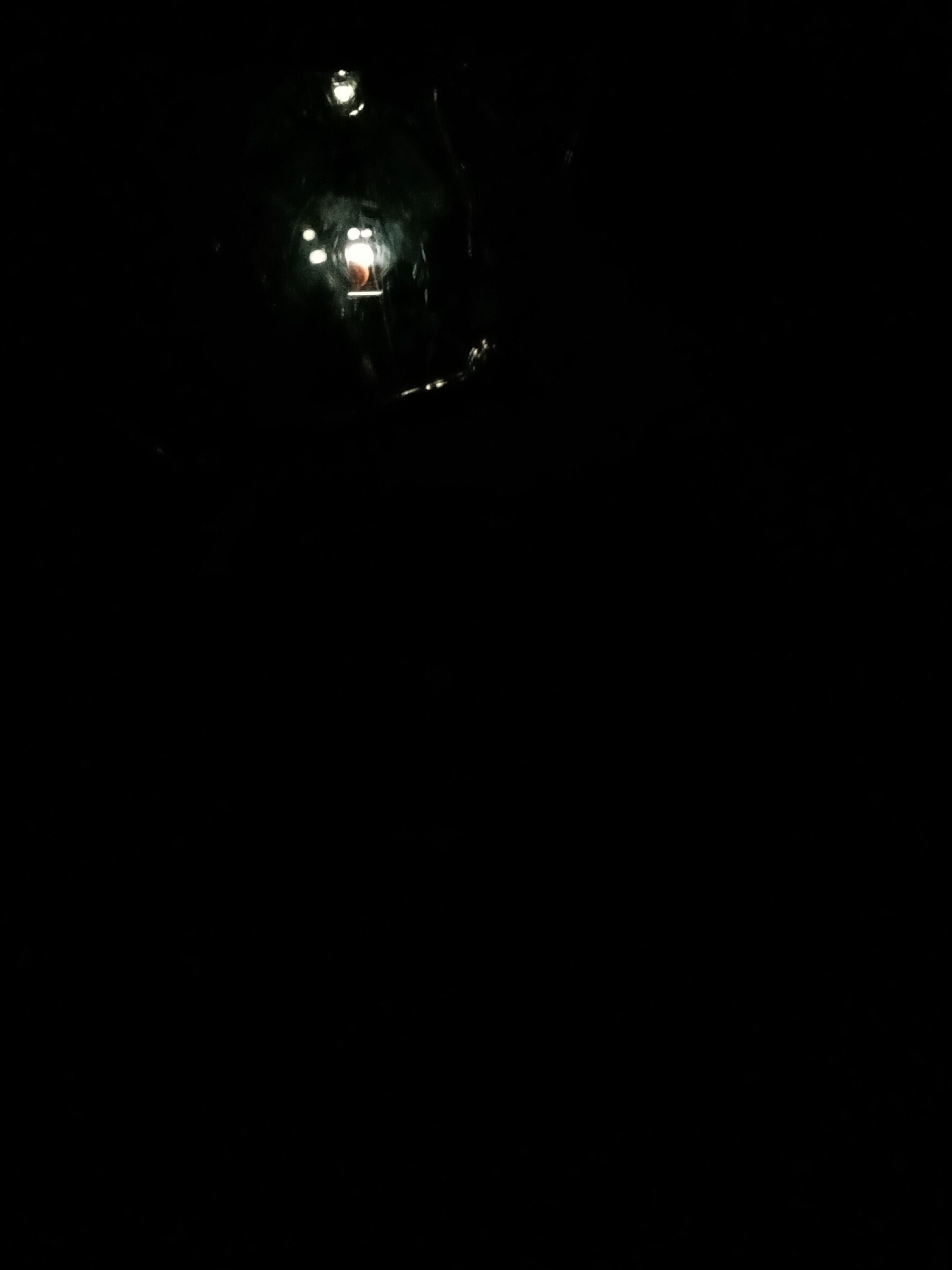 The image depicts a predominantly dark, almost entirely black scene, indicating nighttime or an extremely dim environment. In the upper right quadrant, various artificial light sources are visible as…read more