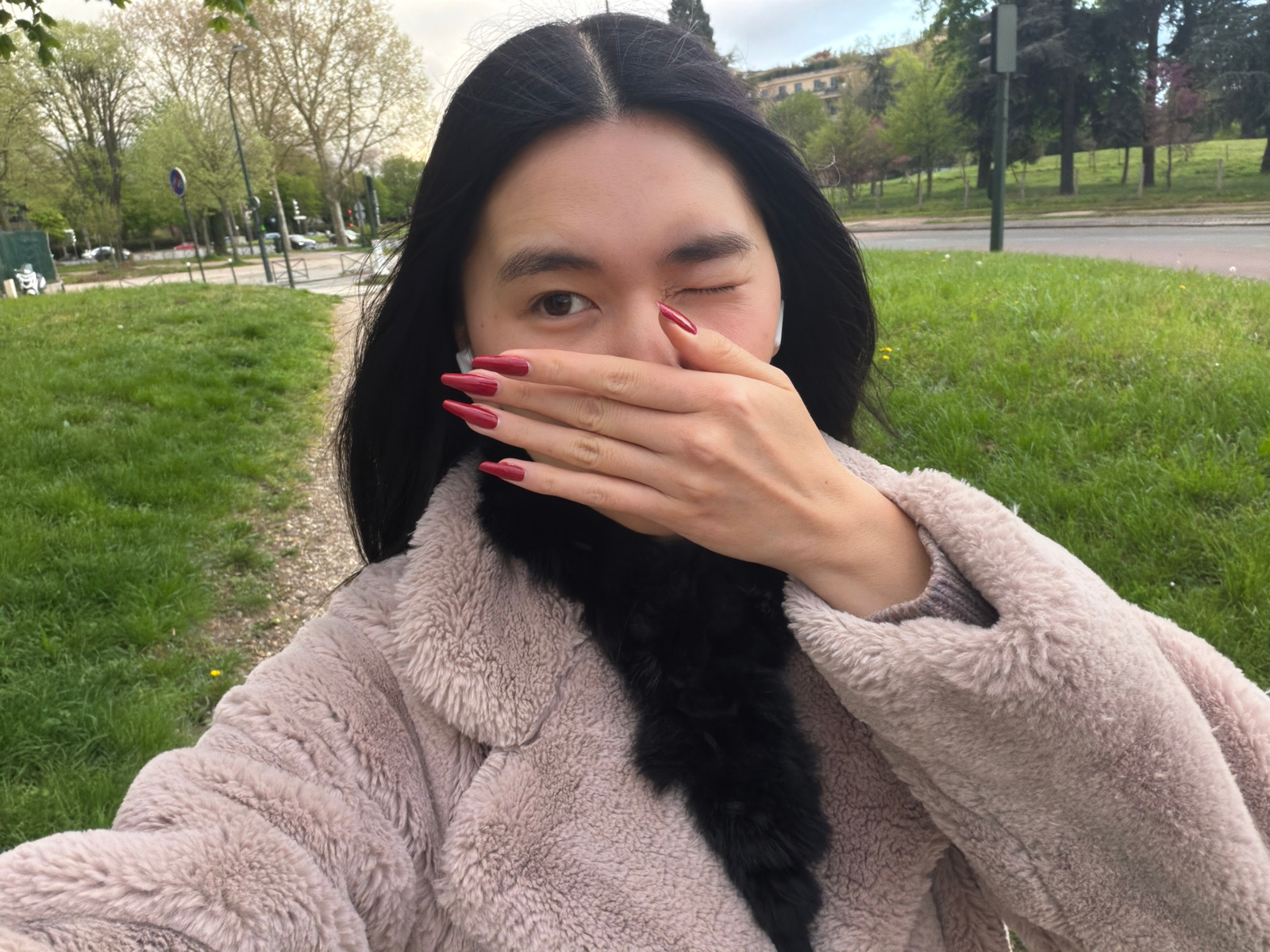 A young woman with long dark hair is winking at the camera while holding her hand over one eye. She has dark red fingernails and is wearing a plush, light-colored jacket with a black fur-like collar o…read more