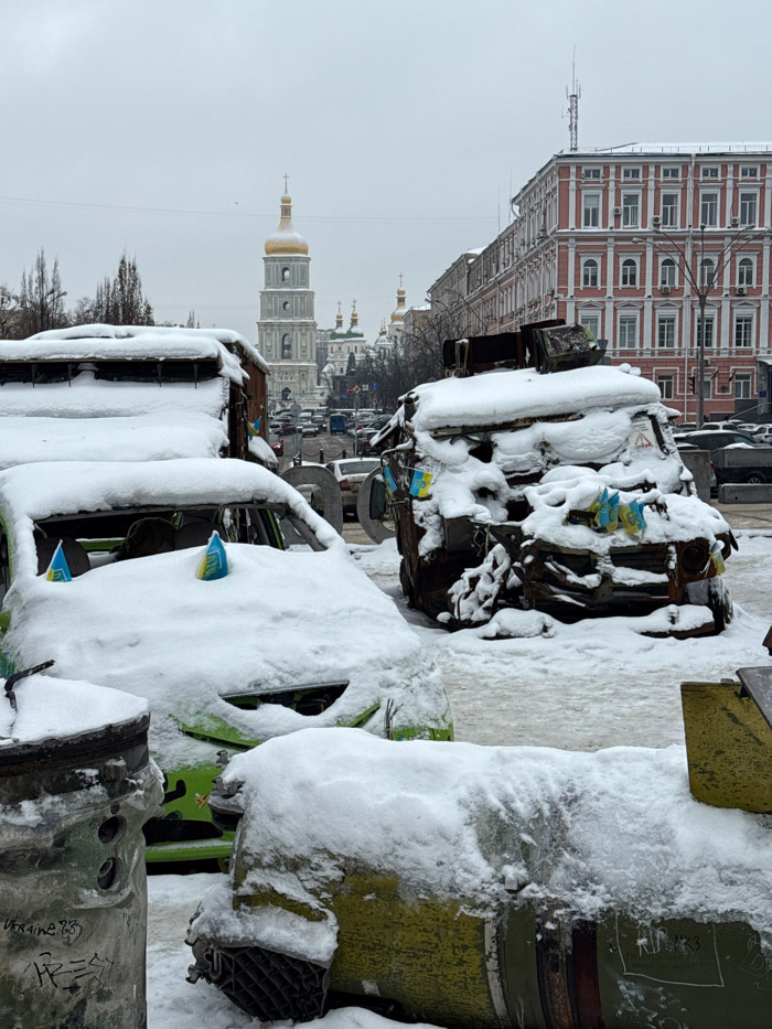 The image depicts an outdoor scene in Kyiv, Ukraine, during winter, with ground and objects covered in a layer of snow under an overcast sky. In the foreground and midground, three severely damaged, s…read more