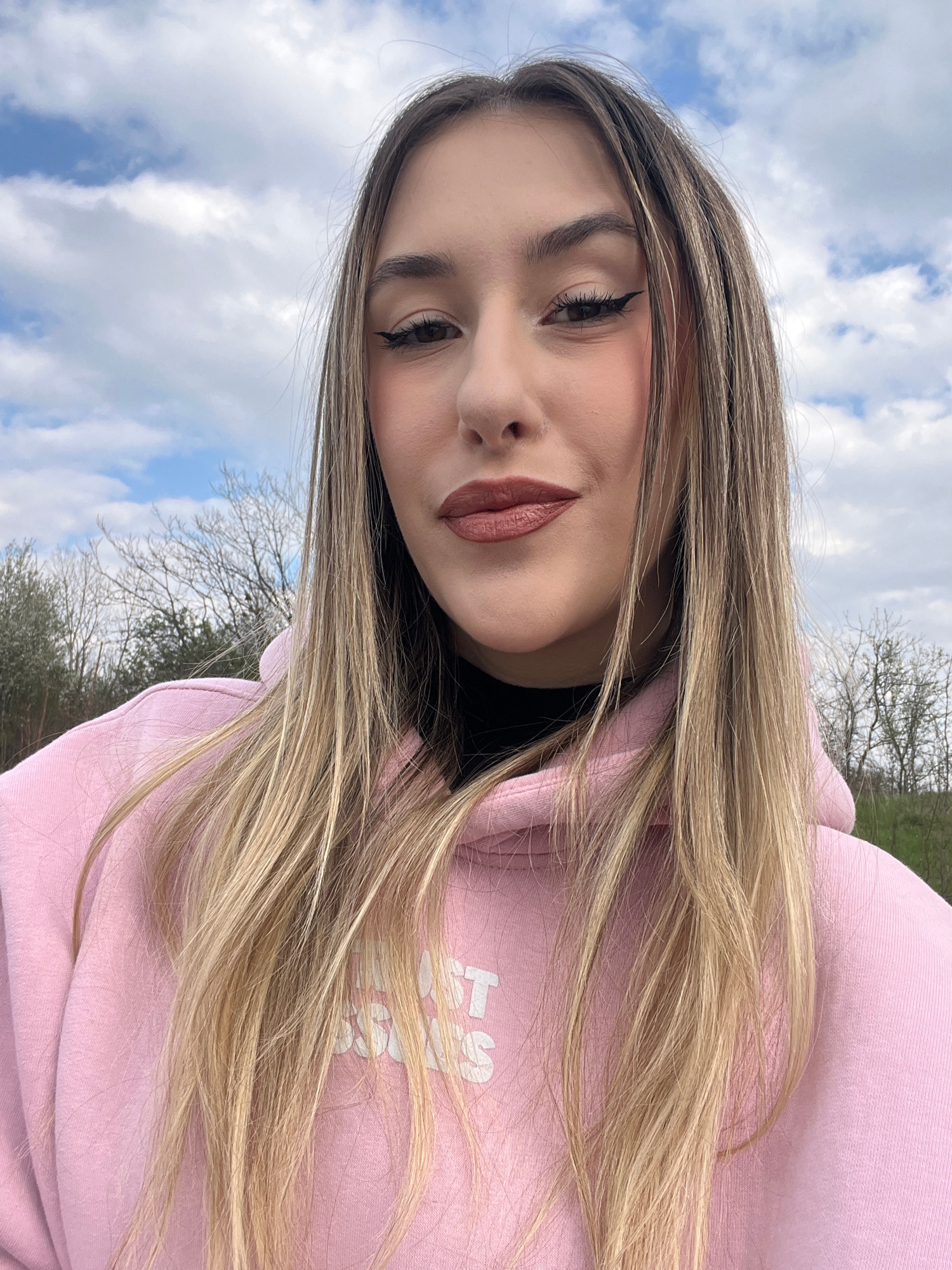 A young woman with light brown hair is wearing a pink hoodie. She is angled slightly to the left and looking down at the camera. The background shows a blue sky with clouds and trees with bare branche…read more