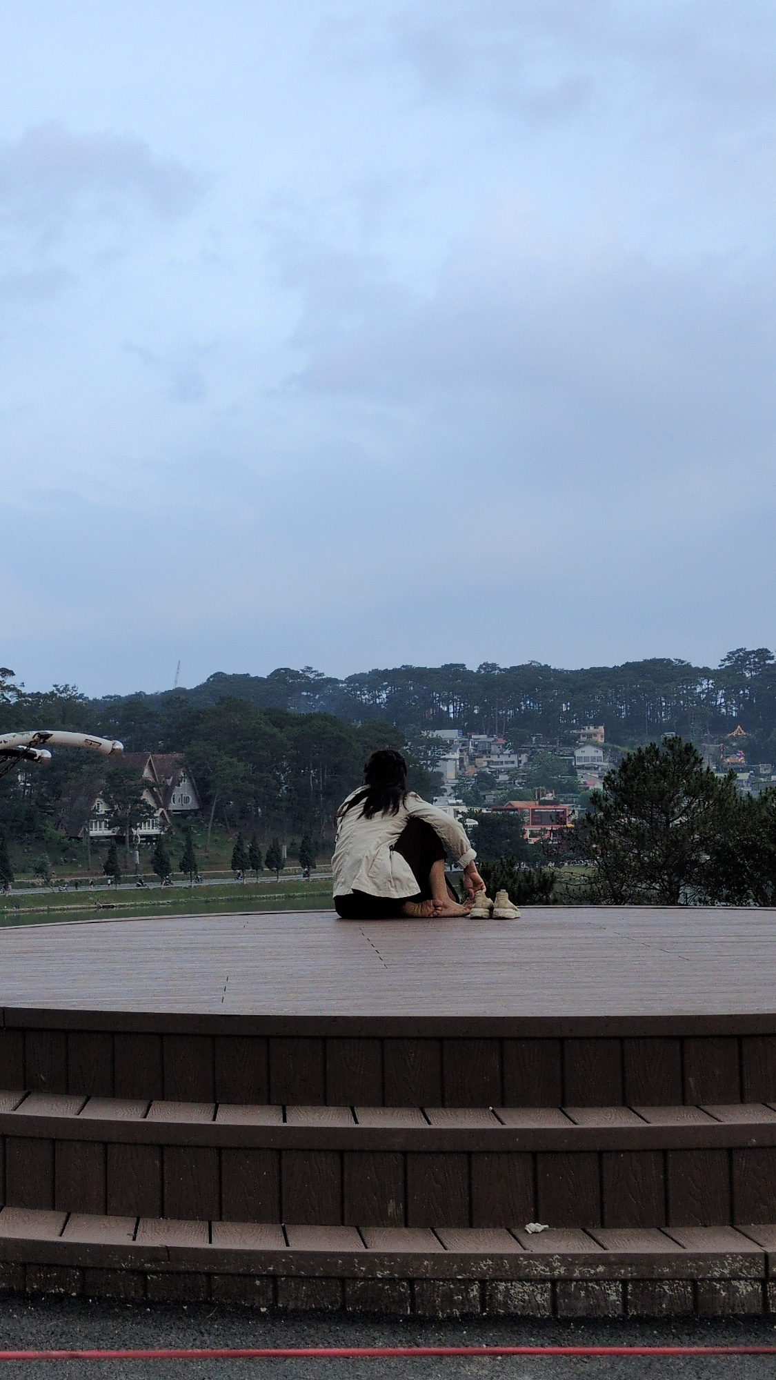 A woman sits on a wooden ledge overlooking a cityscape in Xuân Hương - Đà Lạt, Vietnam. She is curled up, facing the city, wearing a light-colored shirt and dark pants, with shoes on her feet. Behind…read more