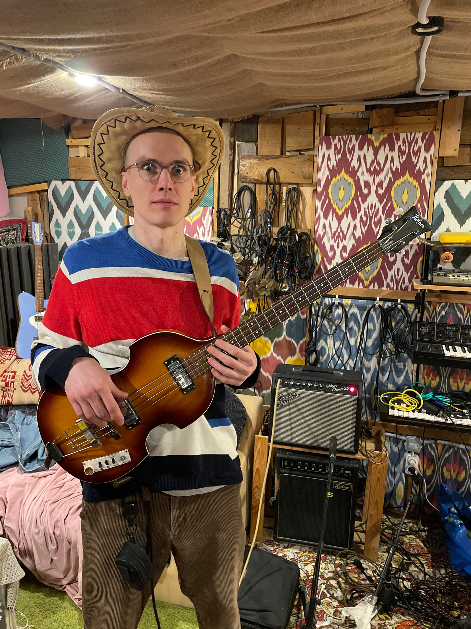 A young man with glasses and a cowboy hat stands in a room holding a Hofner bass guitar. He wears a red, white, and blue sweater and brown corduroy pants. Behind him is a wall decorated with wooden cr…read more