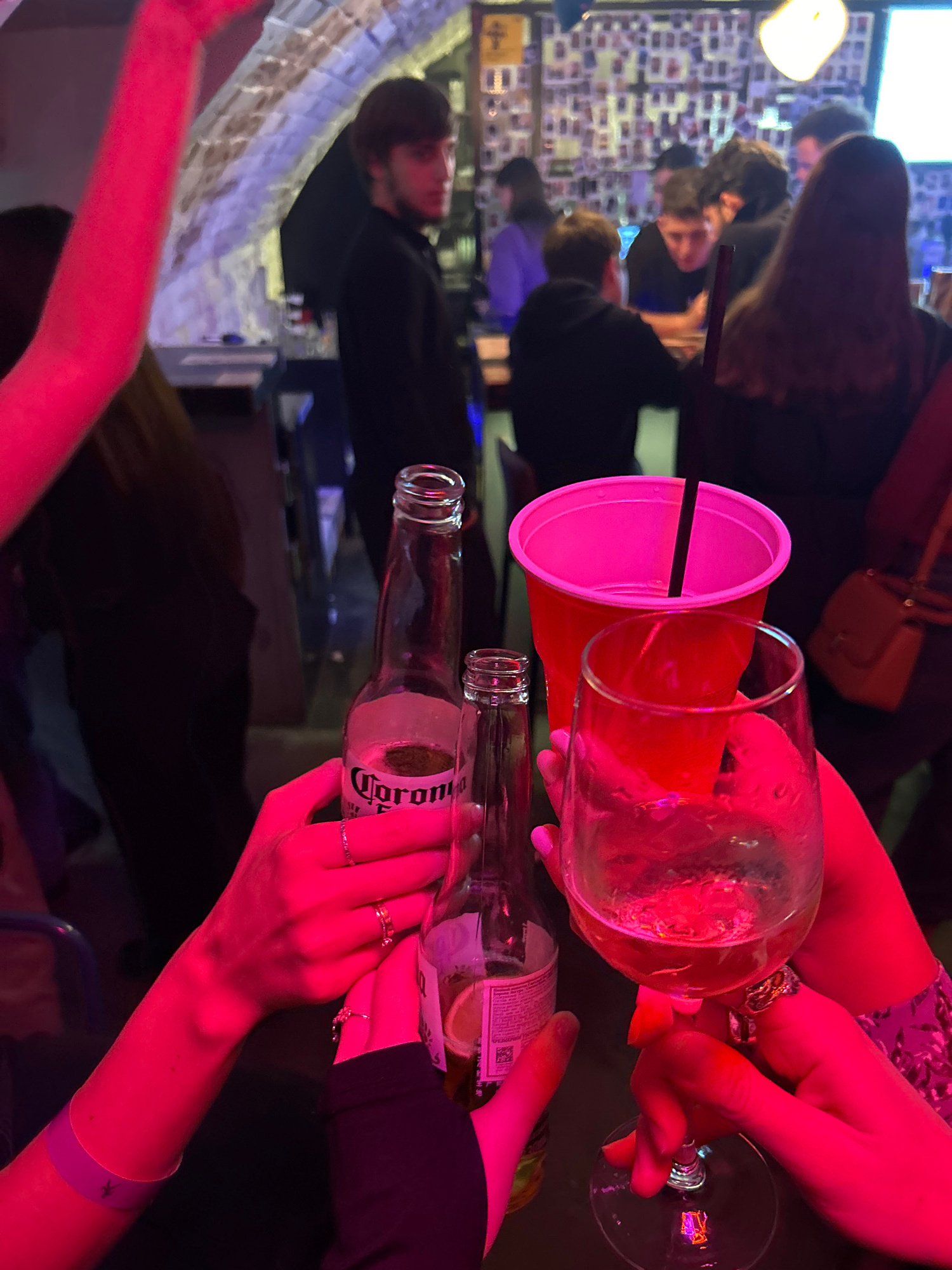 In a dimly lit bar-like environment, multiple people are gathered, illuminated by red and pink lighting. Foreground elements include an overhead view of three sets of hands holding drinks. The left-mo…read more
