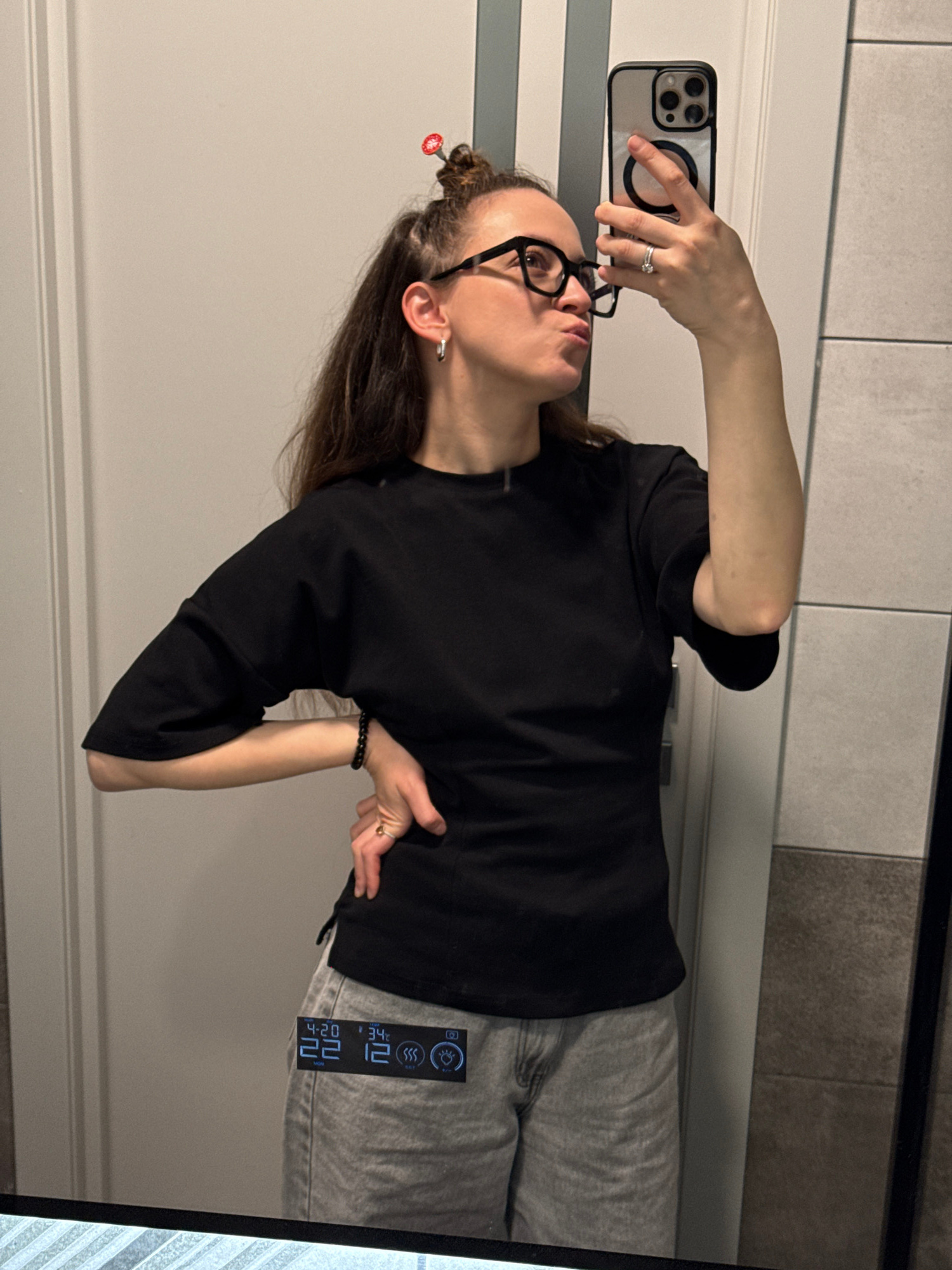 The image, taken in Karsha, Russia, shows a mirror selfie of a person, likely female, captured at a 90-degree clockwise rotation. The subject has long, dark hair, partially tied up with a small red ac…read more