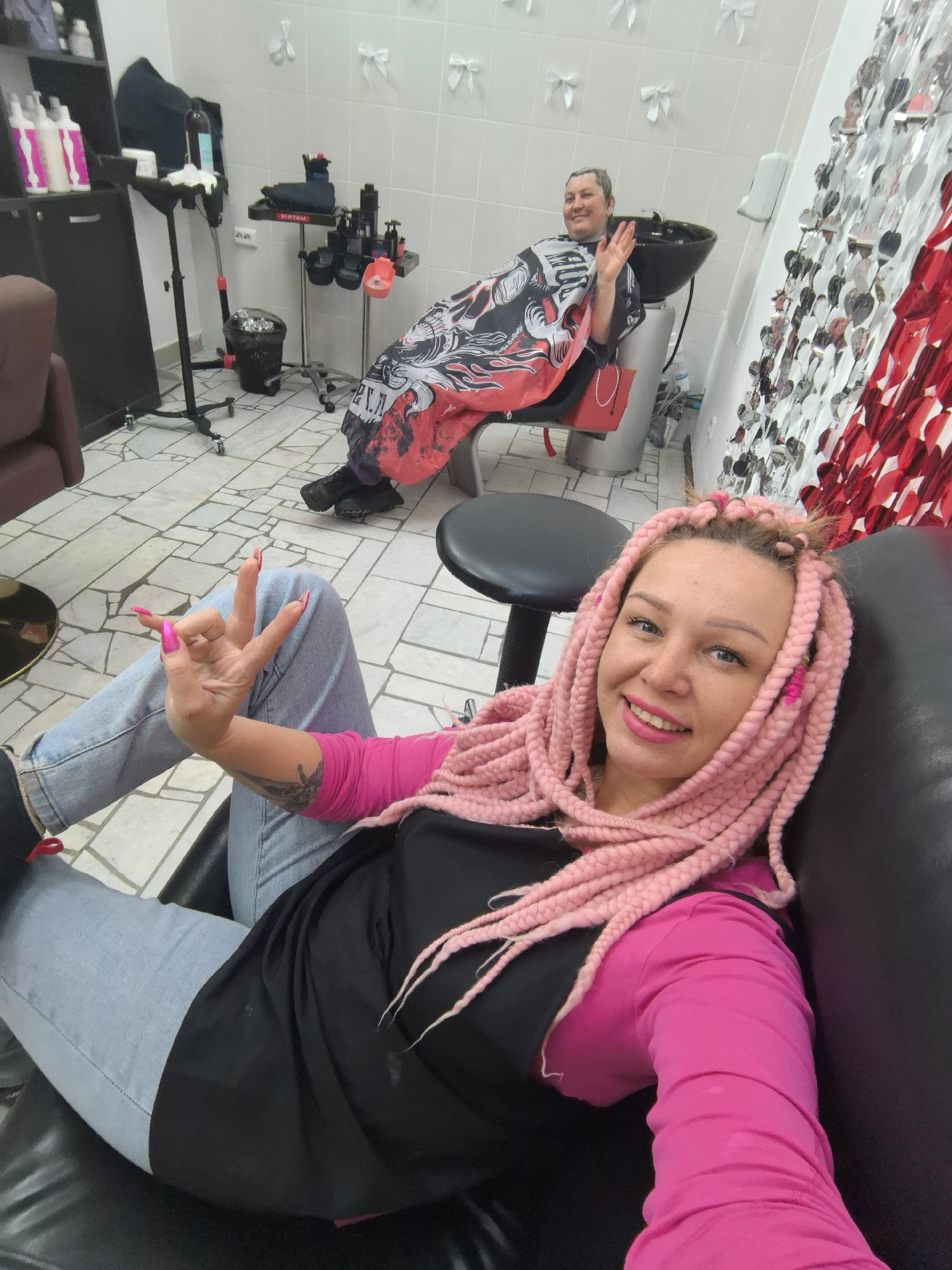 In a brightly lit room, possibly a hair salon in the city of Chaikovsky, Russia, a woman with pink braids is reclining in a black chair. She is wearing a pink long-sleeved shirt under a black salon ca…read more