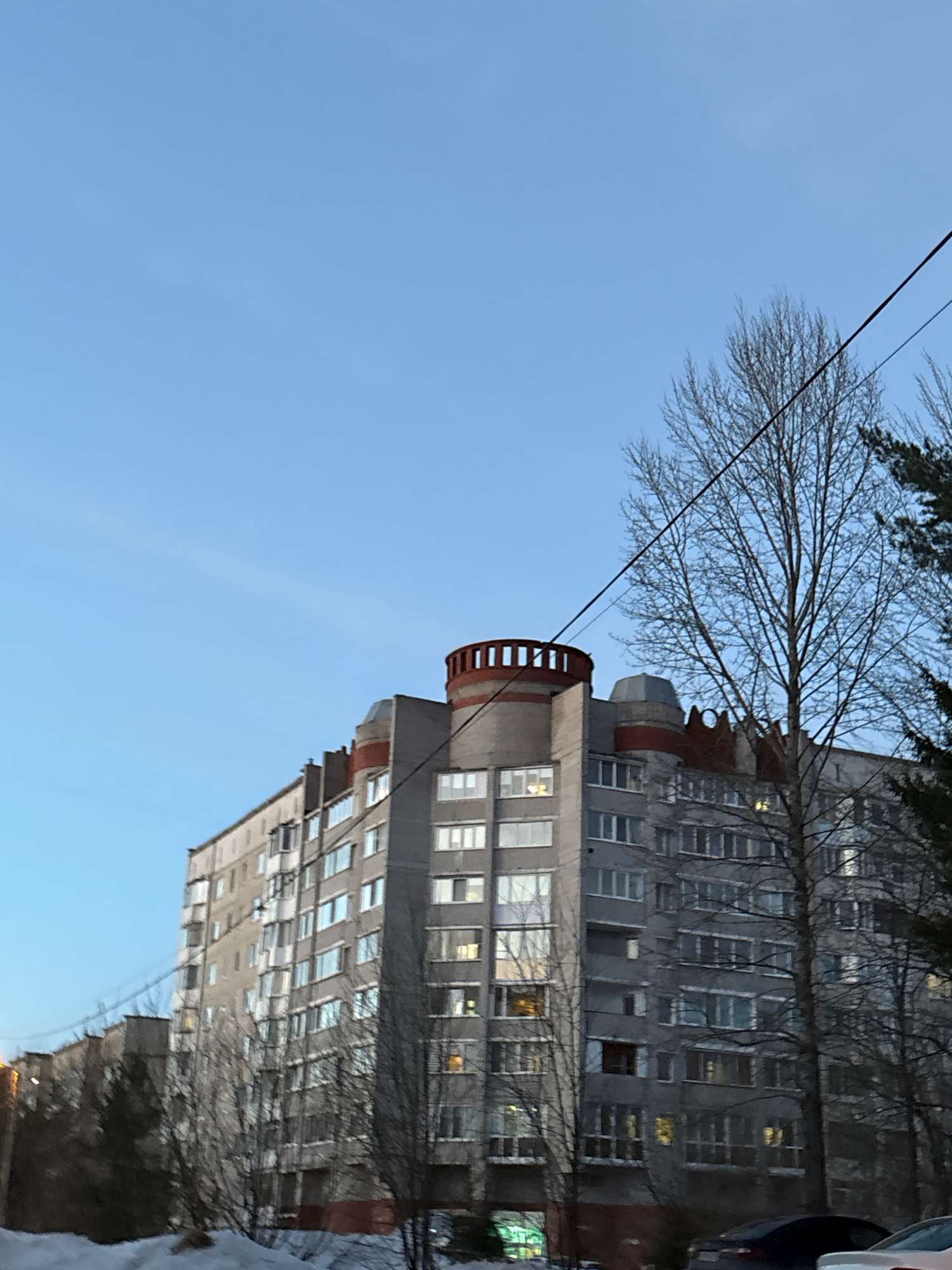 The image shows a multi-story apartment building in Berezniki, Russia. The building has a distinct cylindrical feature with a red railing near the top. The architecture is typical of Soviet-era constr…read more