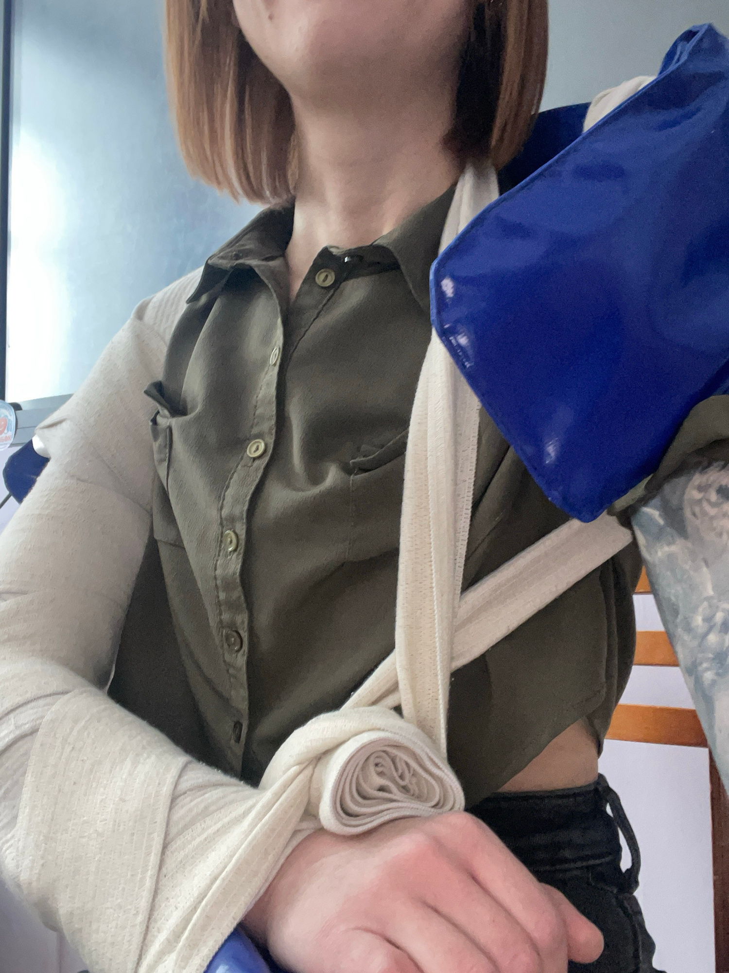 A person with light brown hair is wearing an olive green button-down shirt and black pants. Their arm is supported by a white cloth sling that extends up to their neck, where a blue cold pack rests. T…read more