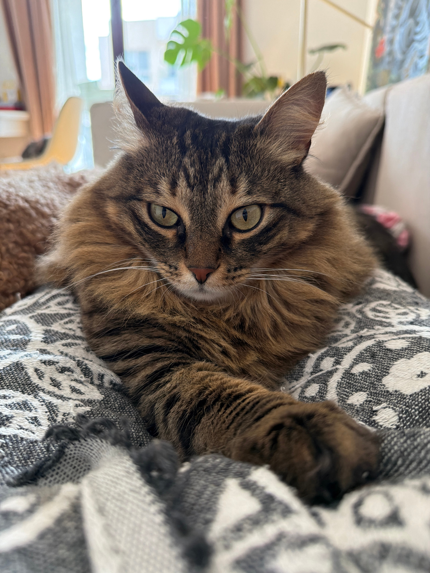 A close-up, eye-level shot of a brown tabby cat lying on a gray and white patterned blanket. The cat's head is tilted to the left, with one ear visible and erect. The cat has green eyes and white whis…read more