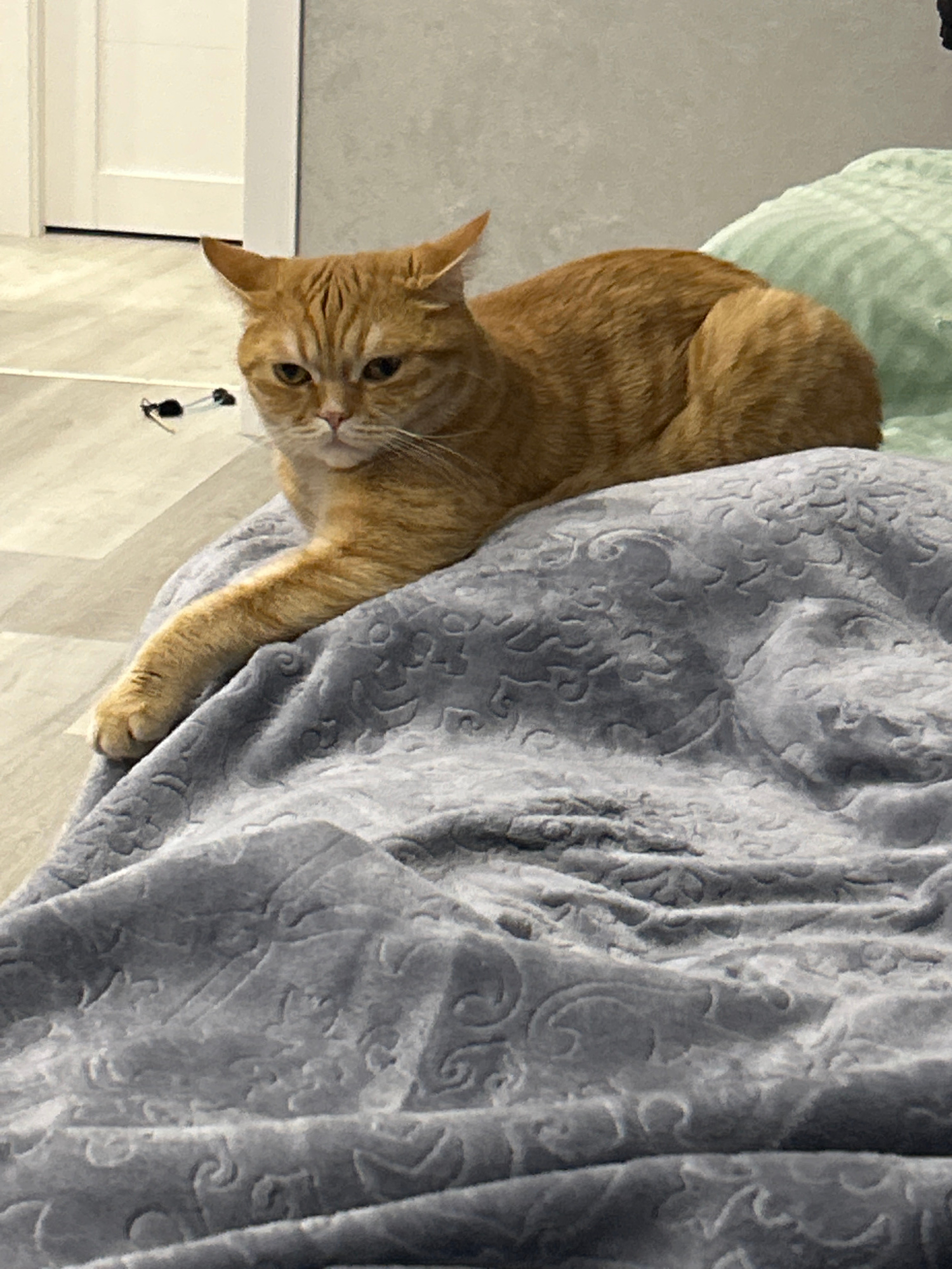 An orange tabby cat is lying on a patterned grey blanket. The cat is facing the camera with its paw extended onto the blanket. The background includes a green pillow and a white cabinet. The image was…read more