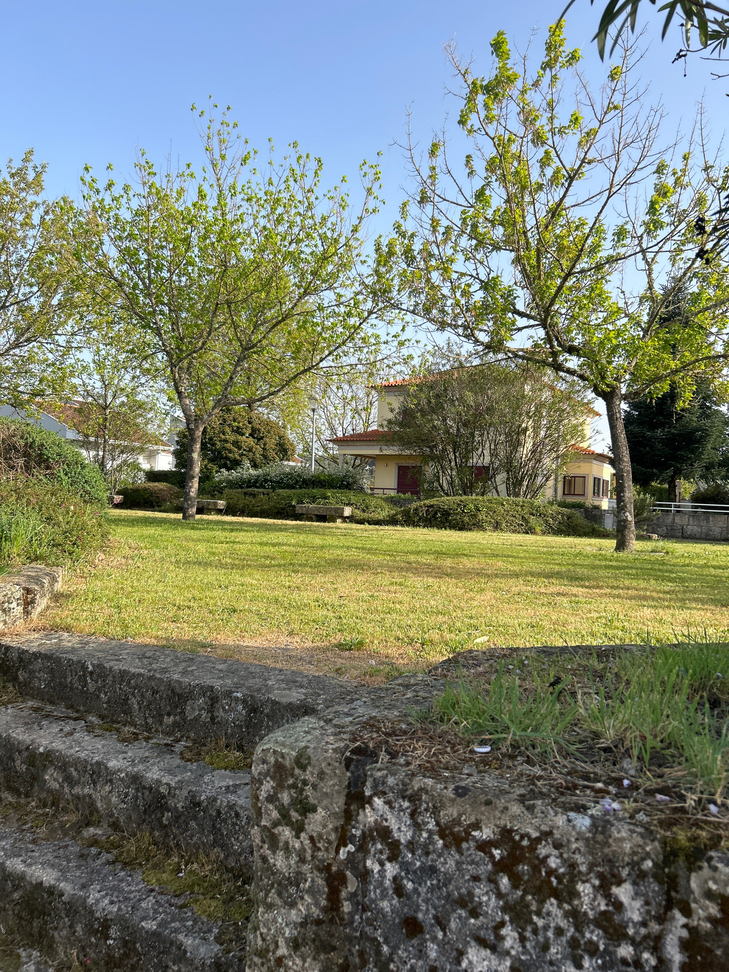 The image captures a grassy area in Vila Real, Portugal, adjacent to a weathered stone structure. Two trees with budding leaves frame the scene, extending towards a clear blue sky. In the background,…read more