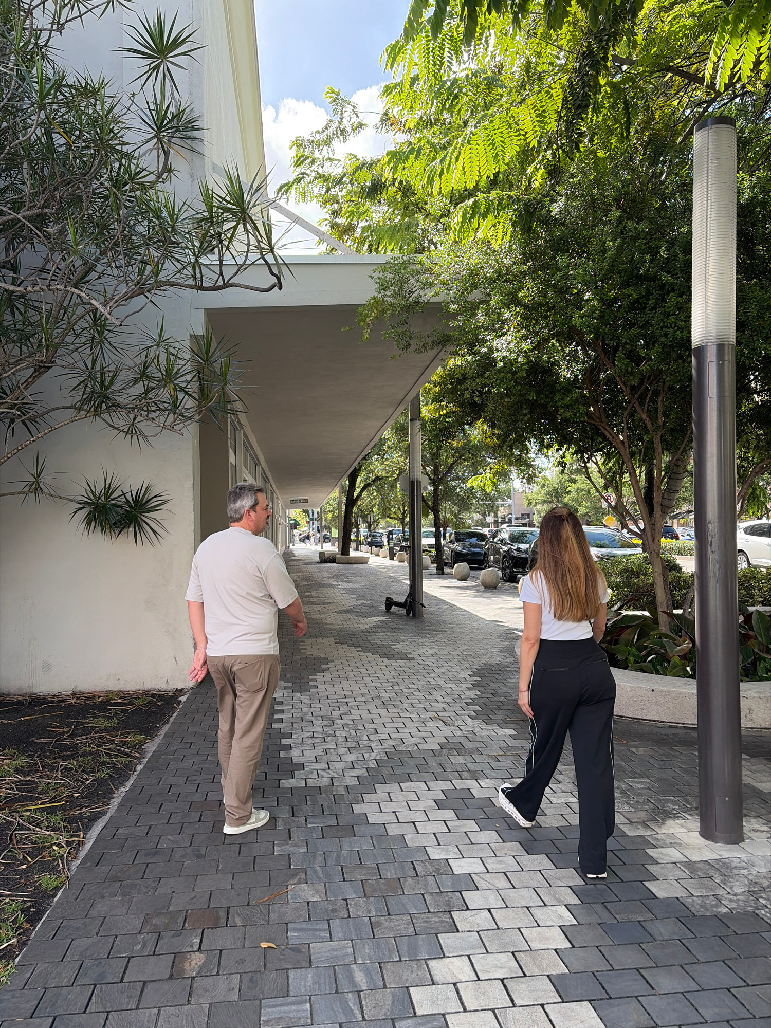 The image shows a sidewalk scene in Coral Gables, Florida. A man and a woman are walking on a gray brick sidewalk. The man is wearing a white shirt and khaki pants. The woman is wearing a white shirt…read more
