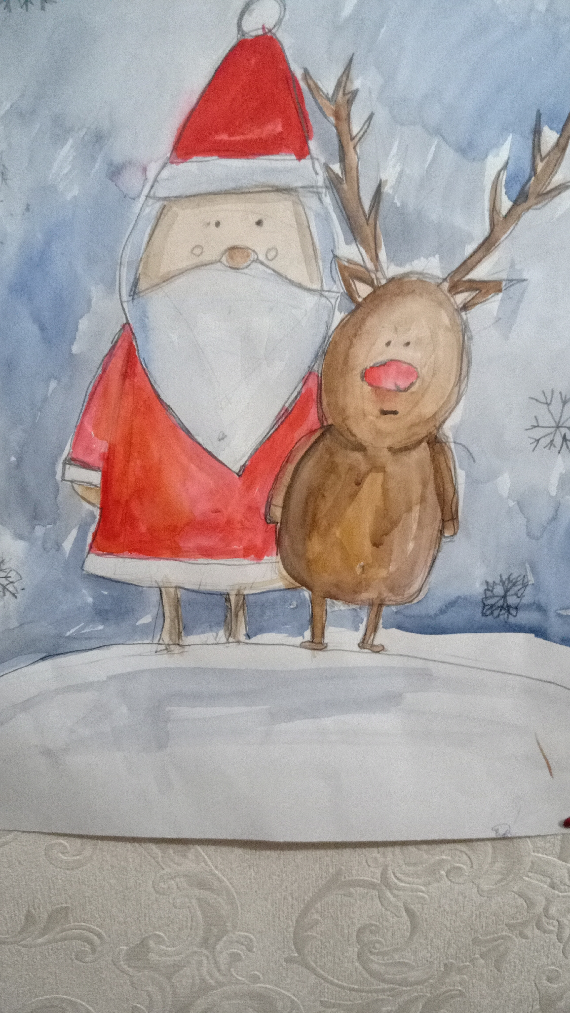 The image is a watercolor painting of Santa Claus and Rudolph the Red-Nosed Reindeer. Santa wears a red hat and coat, with a white beard and trim. Rudolph is brown with large antlers and a red nose. T…read more