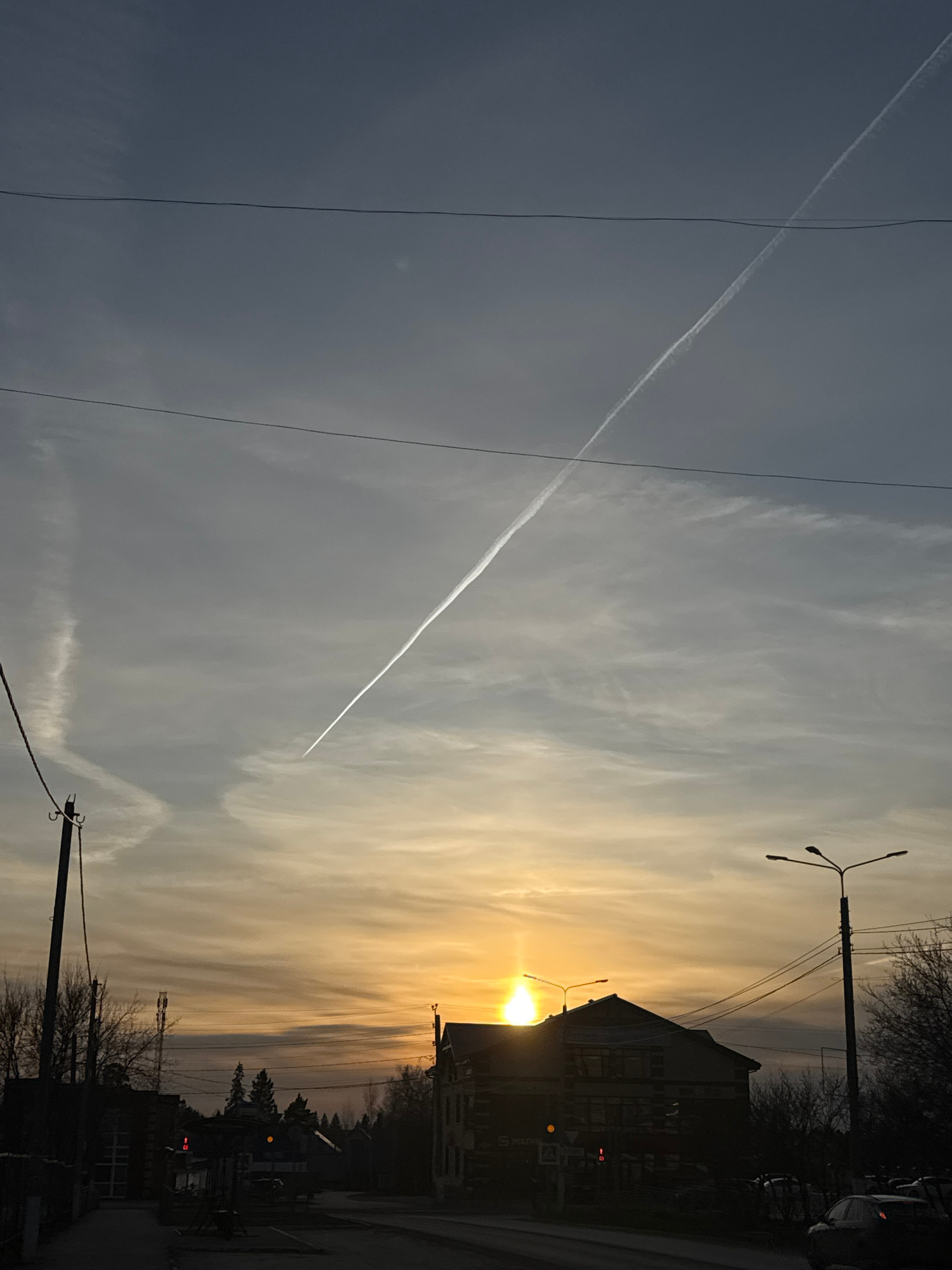 The image shows a street scene in Chernushka, Russia at dusk or dawn, with the sun low on the horizon, obscured by buildings and casting a golden glow in the sky. A contrail stretches across the upper…read more