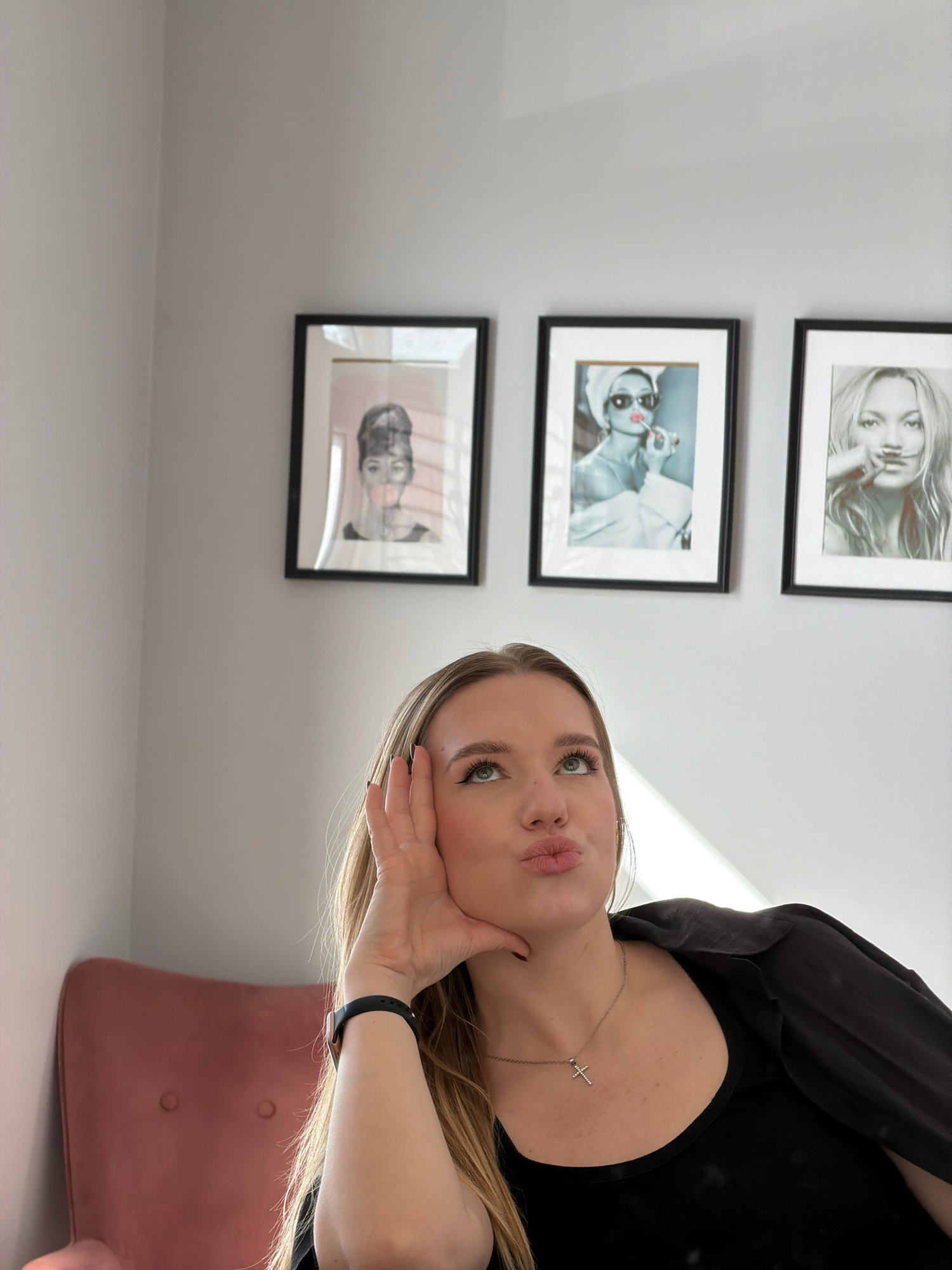 A young woman poses indoors, facing the camera with pursed lips and her right hand placed under her chin. She has fair skin, blonde hair, and is wearing a black top and a silver necklace with a cross…read more
