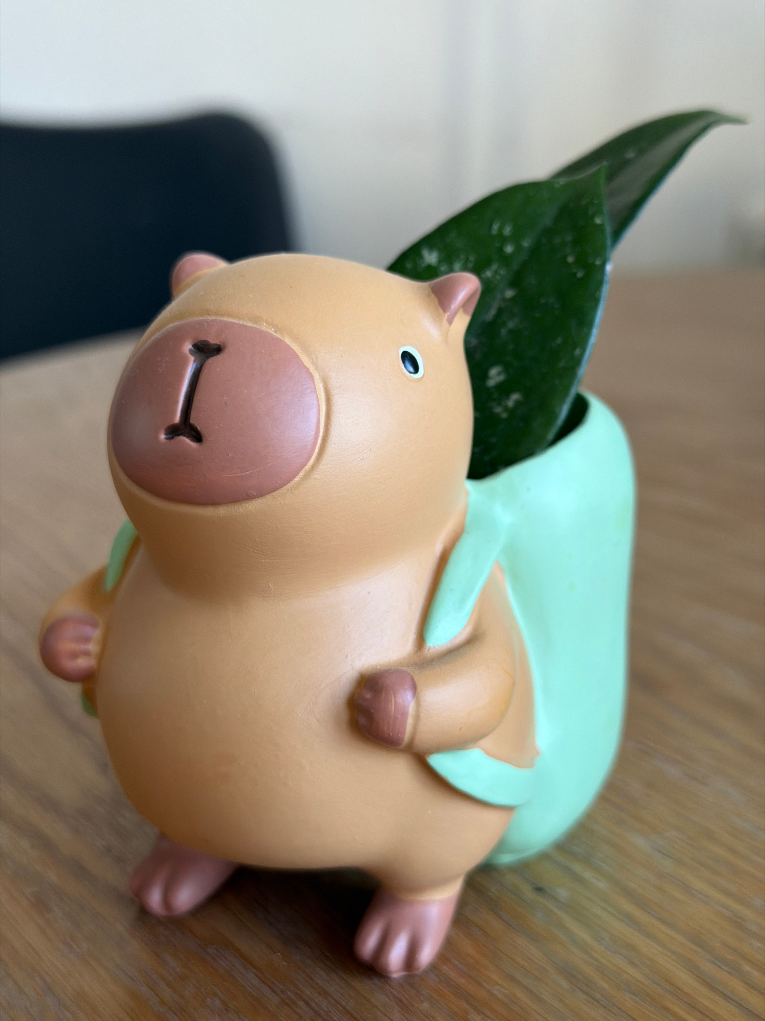 A tan and brown pig figurine with a cartoon-like design, complete with a snout featuring a horizontal line, is positioned on a wooden surface. The figurine is also equipped with a light green hat and…read more