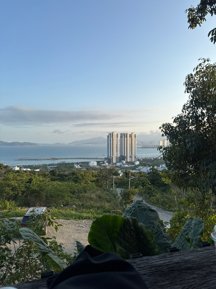 The image displays a panoramic, elevated view of Nha Trang, Vietnam, observed from a hillside northwest of the Hon Chong Promontory. The scene is illuminated by late afternoon or early evening light,…read more
