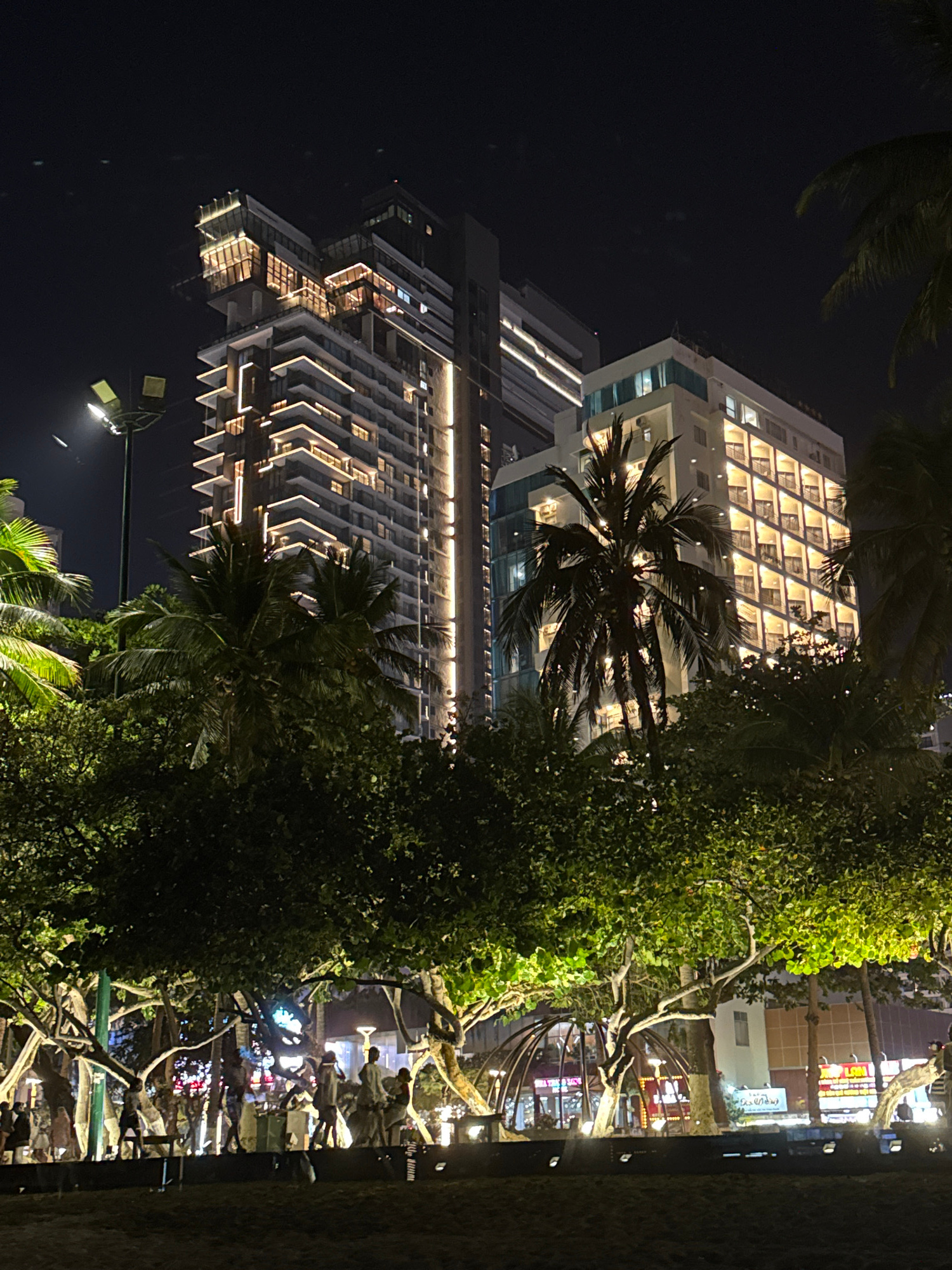 Captured at night, the image features two high-rise buildings in Unknown, Unknown. The building on the left exhibits a terraced design with illuminated balconies, while the building on the right displ…read more