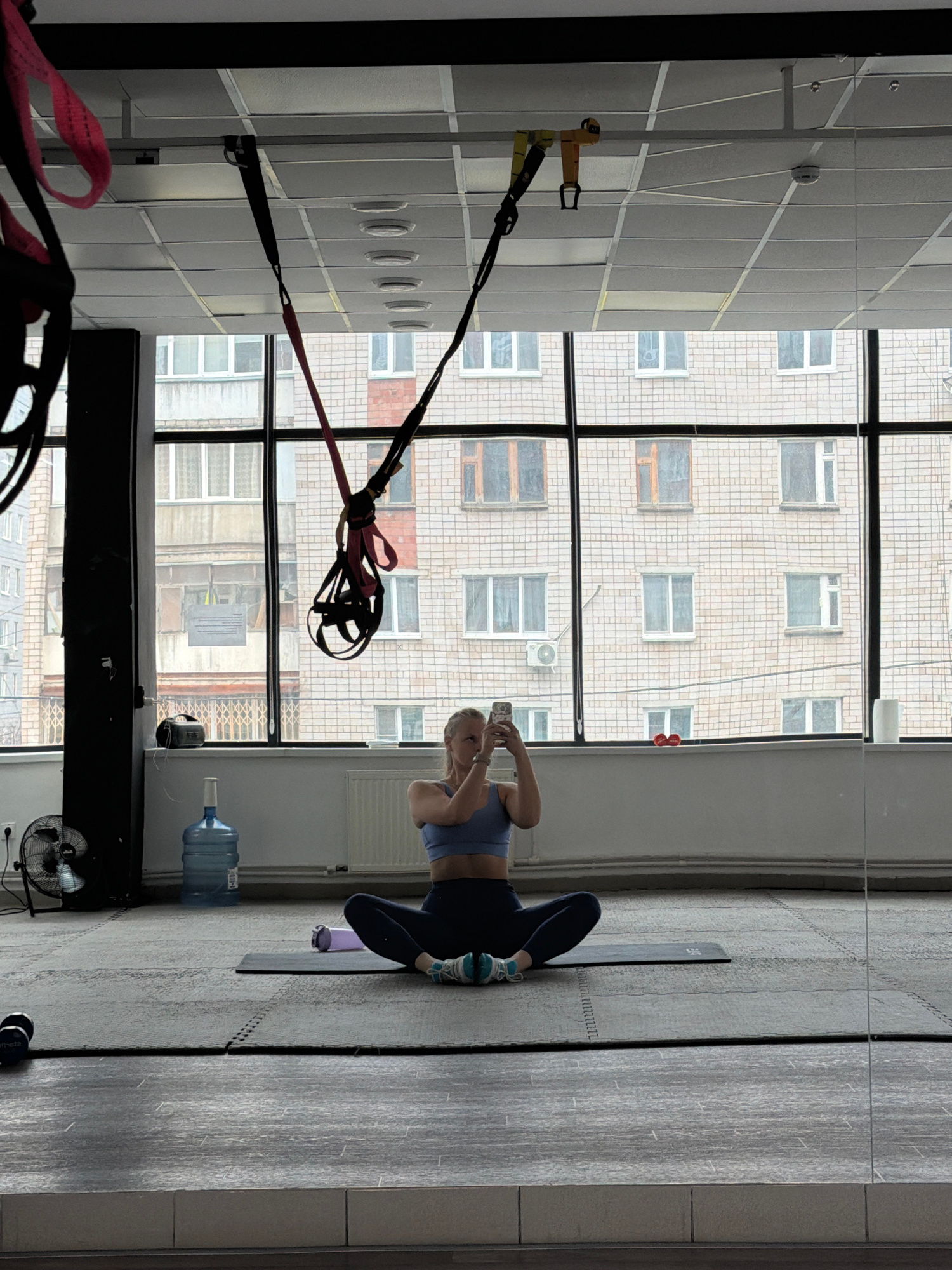 A woman sits on a mat in a gym, taking a photo with her phone. The gym features a wall of windows, through which an apartment building in Izhevsk, Russia, can be seen. Gym equipment, including suspens…read more