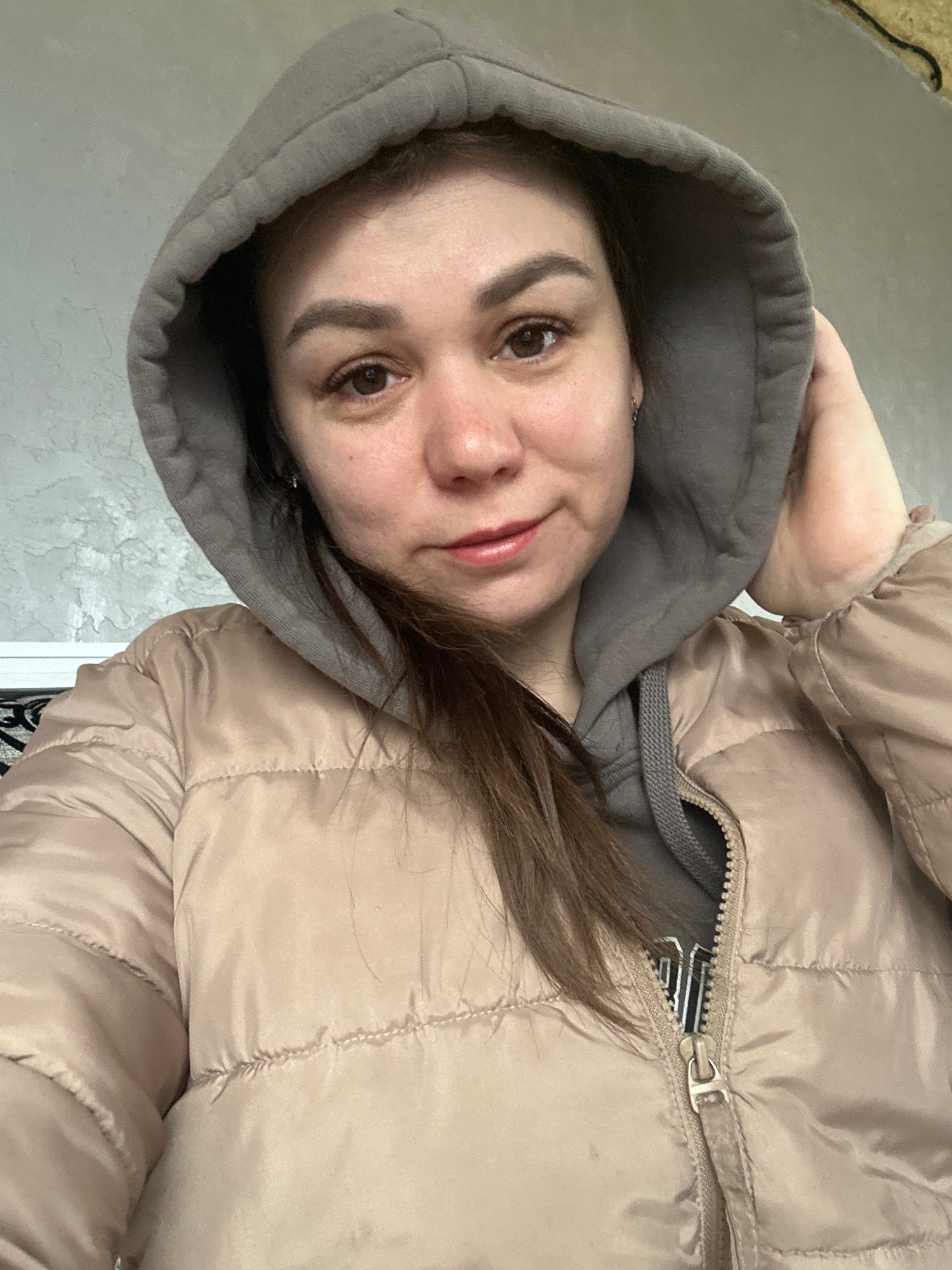 A woman with fair skin and brown hair is wearing a beige quilted jacket with a gray hoodie. The jacket is partially zipped up, revealing a striped garment underneath. The background appears to be a te…read more