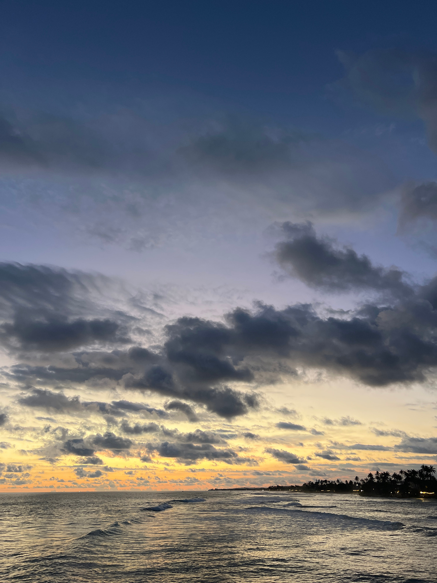 The image captures a dramatic sunset or sunrise over the ocean in Ahangama, Sri Lanka. The sky dominates the upper portion, displaying a vibrant transition from rich golden and orange hues near the ho…read more