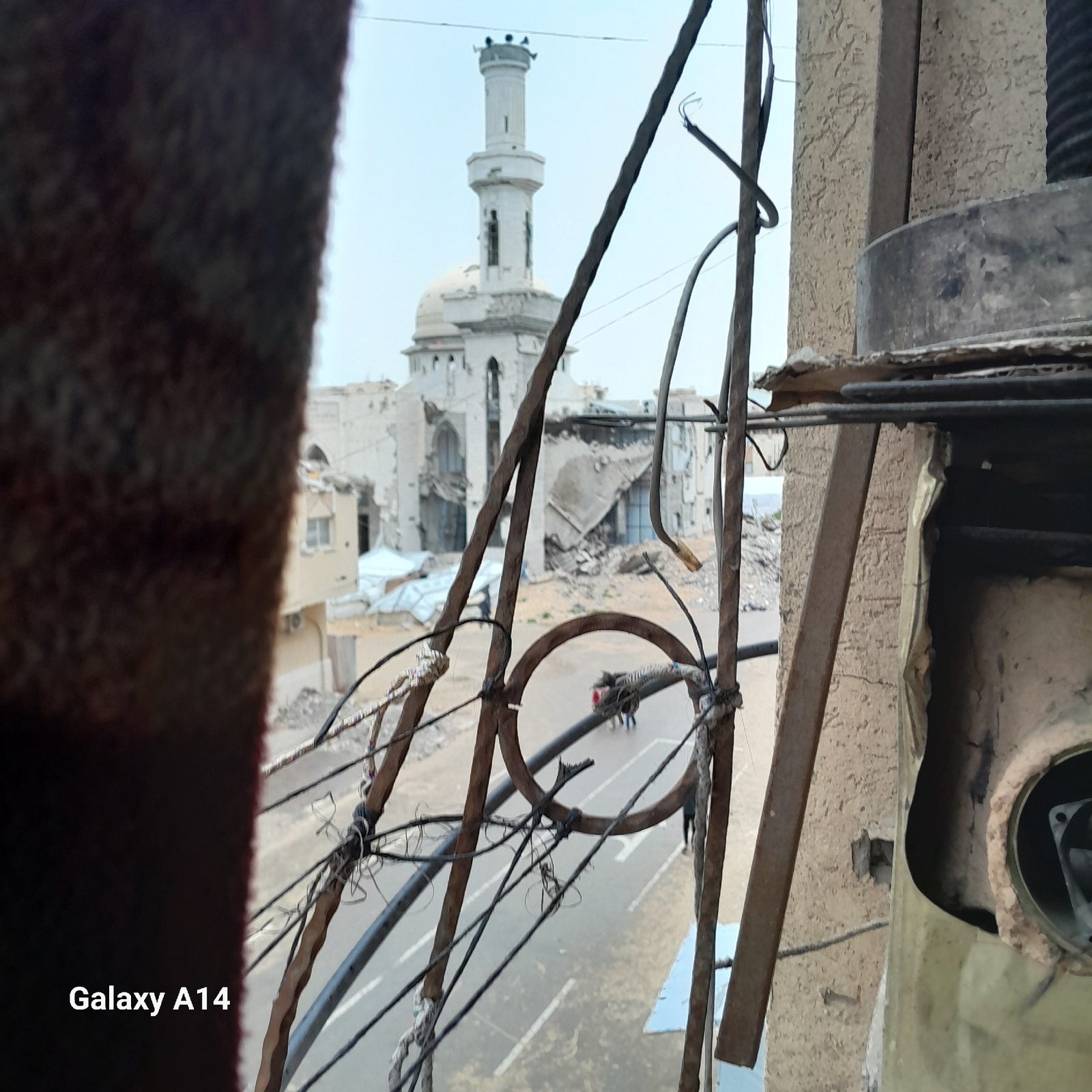 The image, oriented sideways, shows a scene of destruction in Khan Yunis, Palestinian Territory. A tall minaret of a mosque stands amid severely damaged buildings and rubble. Wires and metal structure…read more