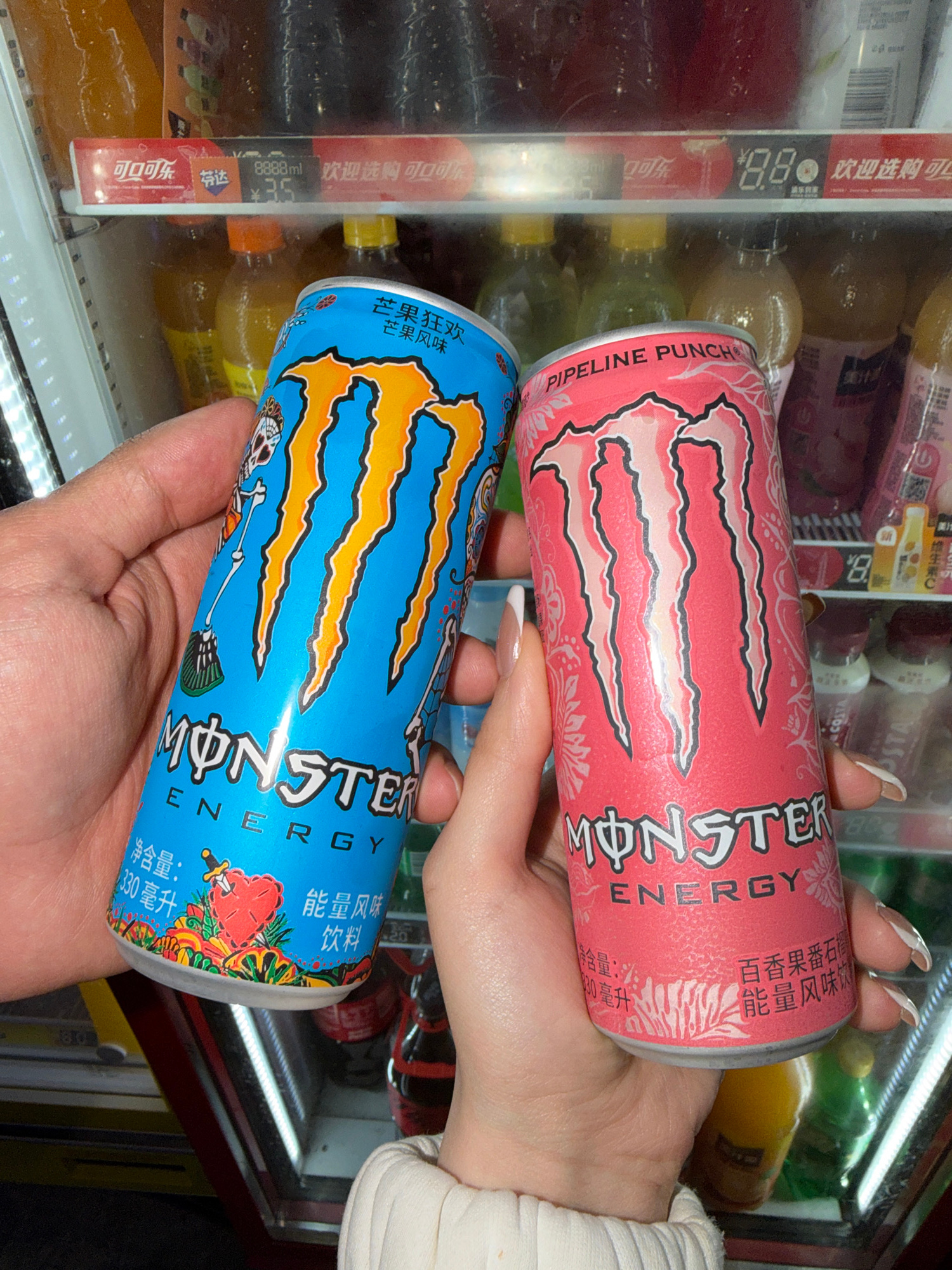 Here is a description of the image: The image shows two cans of Monster Energy drink held by a person or persons in front of a refrigerated display case. The top can is pink with a red monster claw d…read more