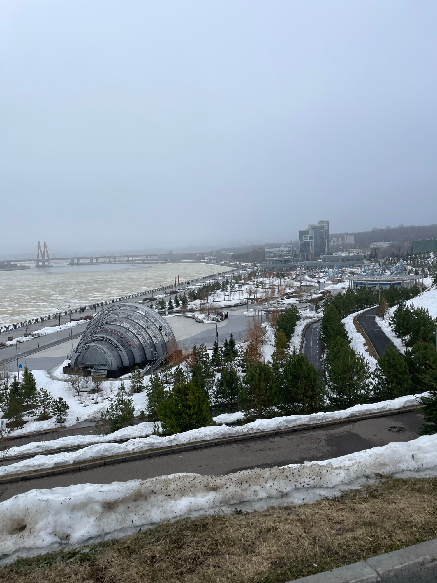 The image shows an elevated perspective of Kazan, Russia, with a heavy fog obscuring the distant cityscape. The foreground features a riverbank with snow patches, bare trees, and evergreen trees. A di…read more