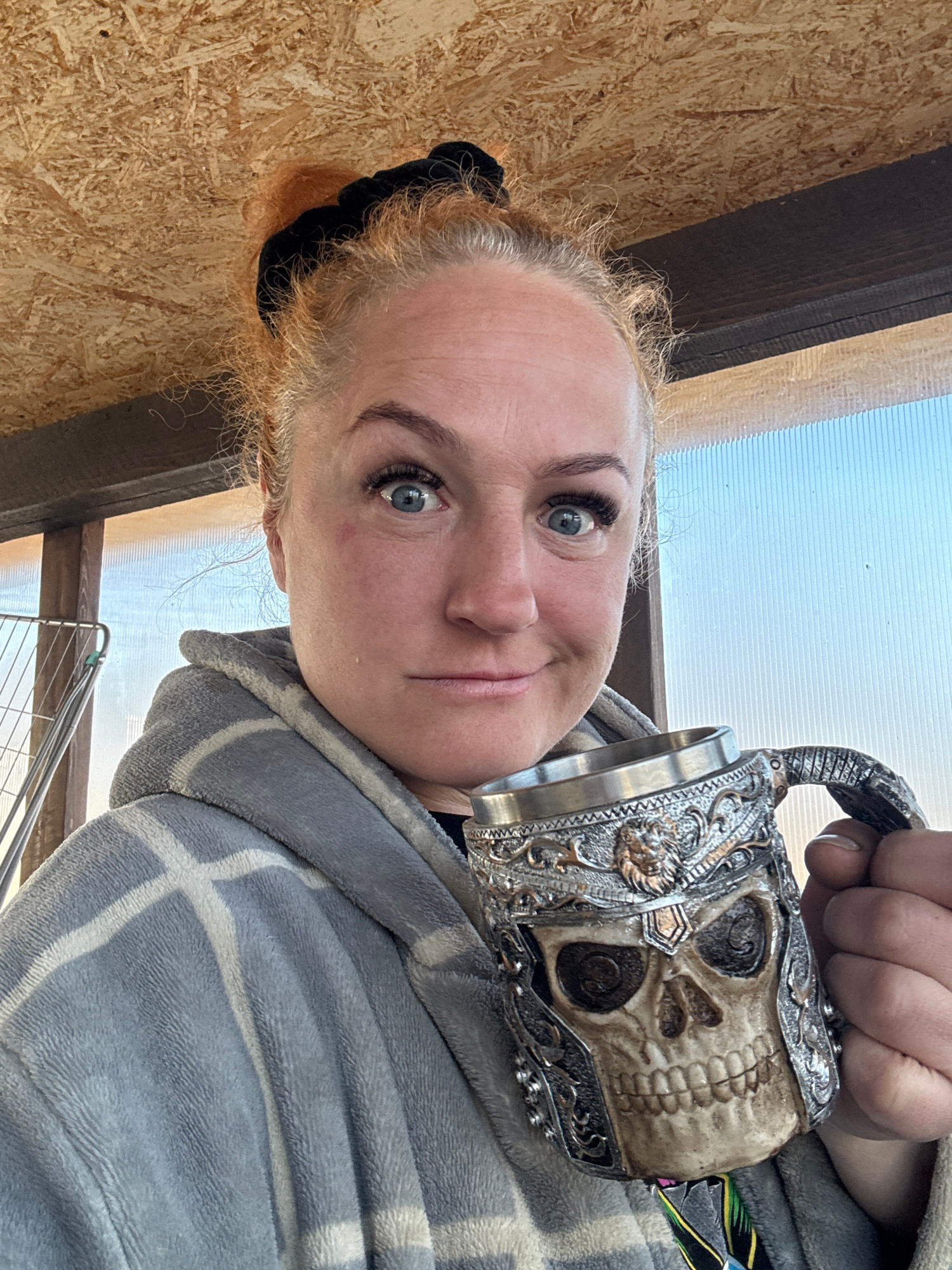 A woman with fair skin and blue eyes is holding a large, ornate skull-shaped mug. She is wearing a gray robe with a white plaid pattern. Her hair is pulled back into a bun. The background includes a w…read more