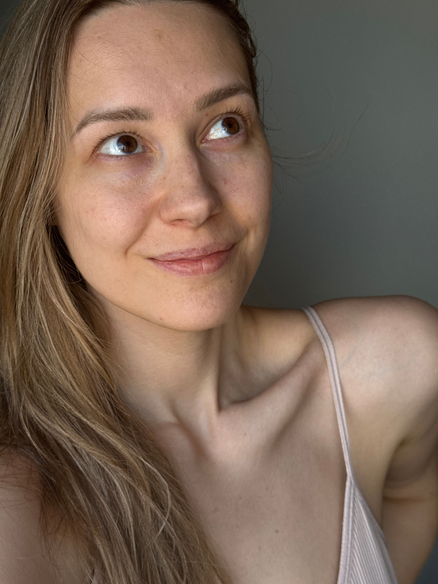 This close-up portrait features a young adult woman, depicted from the chest up and oriented sideways. She has fair skin, with visible freckles across her face and décolletage, and light brown hair th…read more