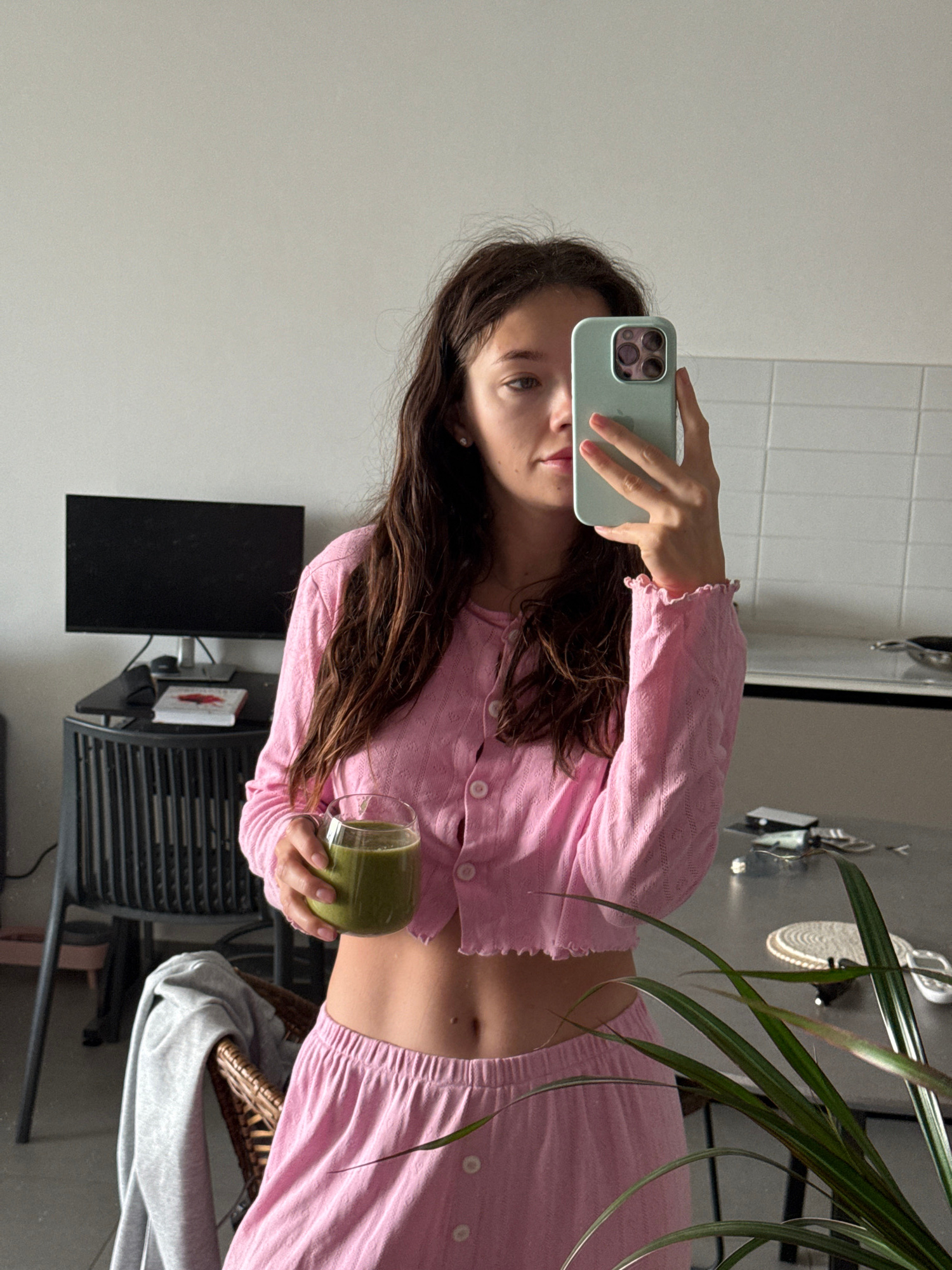 A young woman is taking a selfie in a mirror while holding a green smoothie in a clear glass. She's wearing a pink cardigan with matching pants, revealing her midriff. Her hair is long and brown. Theβ¦read more