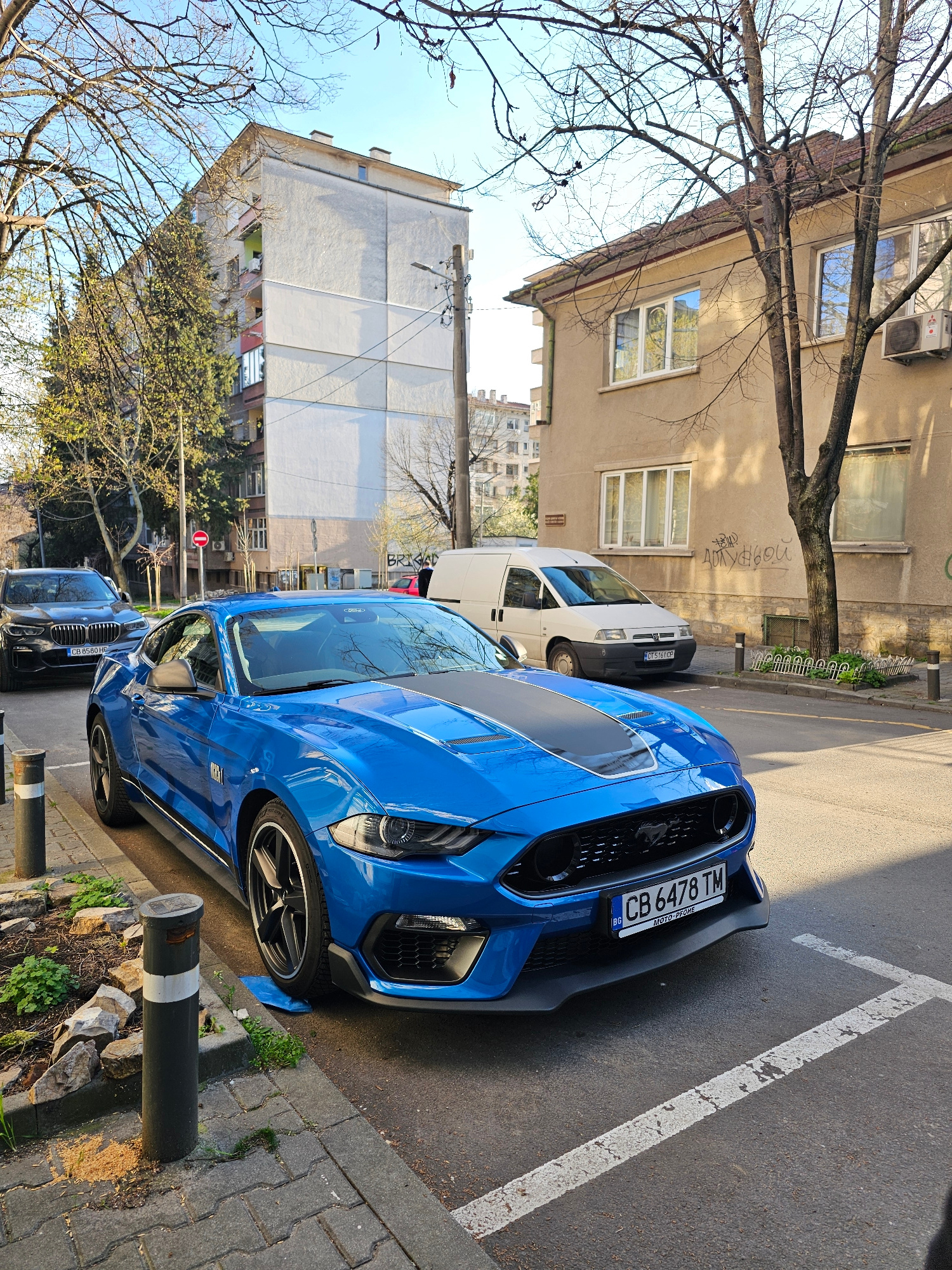 A blue Ford Mustang with Bulgarian license plate "CB 6478 TM" is parked on a paved street in Stara Zagora, Bulgaria. A white van is parked behind it. The surrounding buildings are a mix of residential…read more