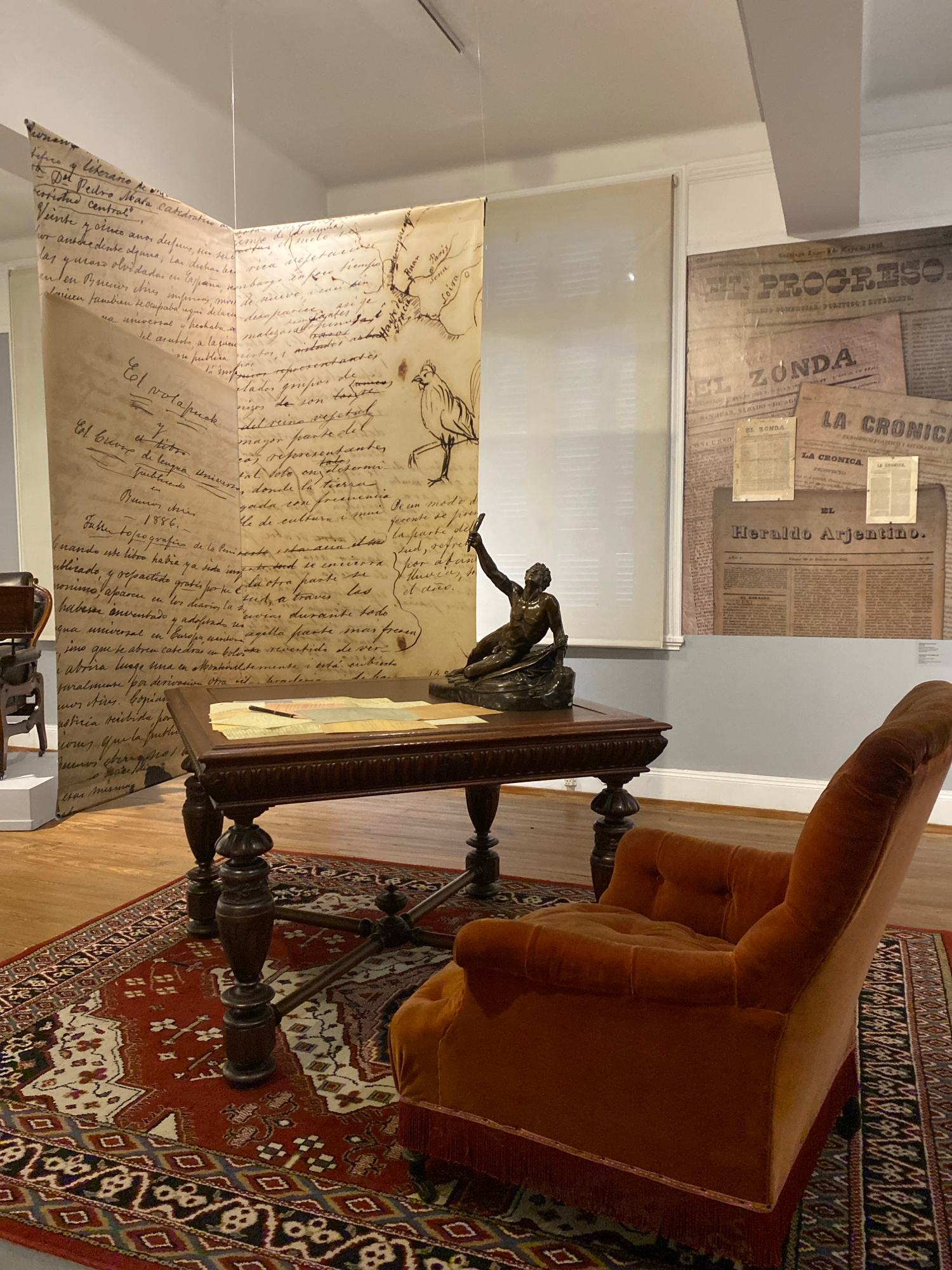 The image shows a room in what appears to be a museum or historical exhibition in Buenos Aires, Argentina. The room features several displays. On the wall behind a desk are newspaper clippings with heβ¦read more